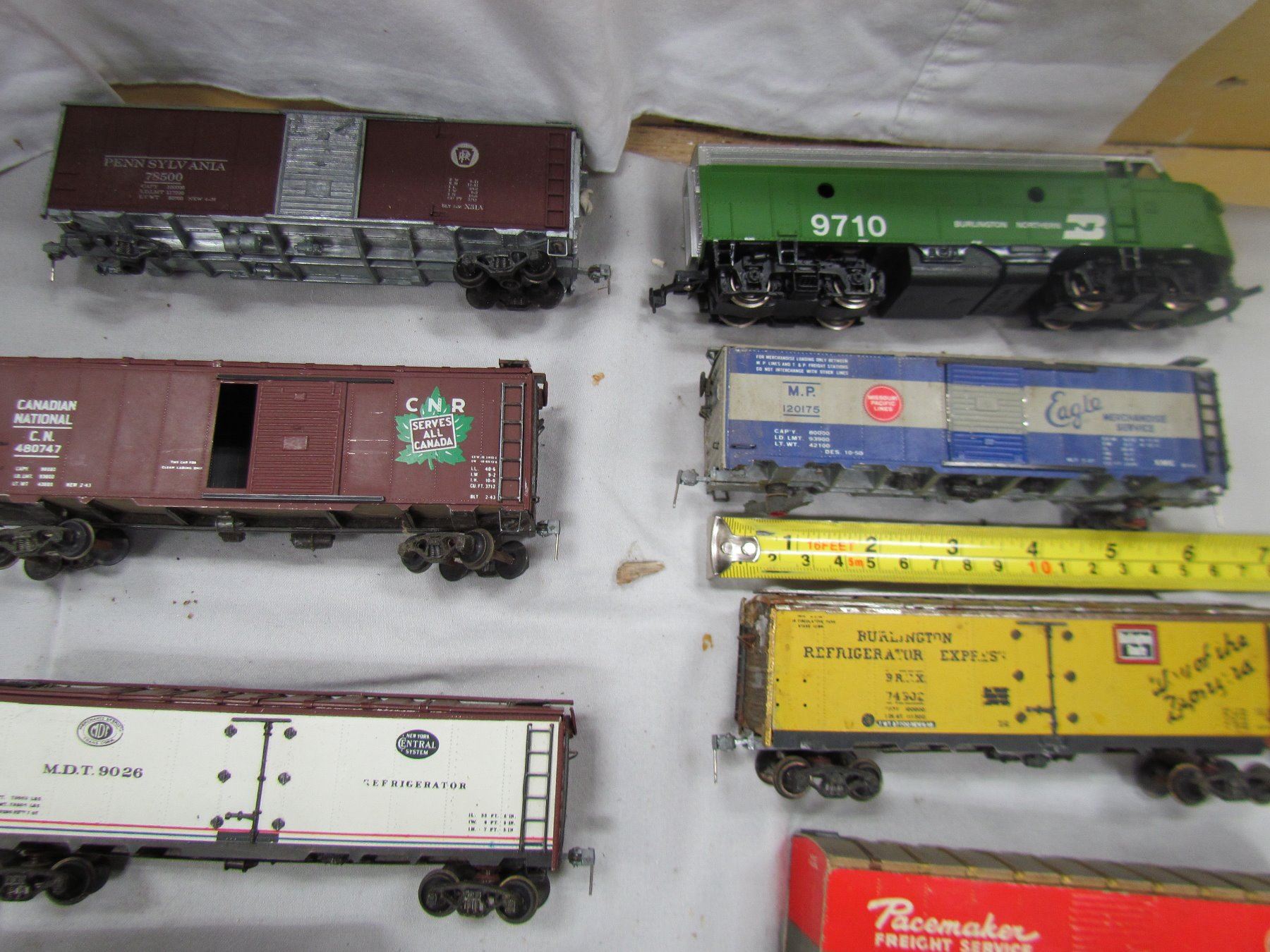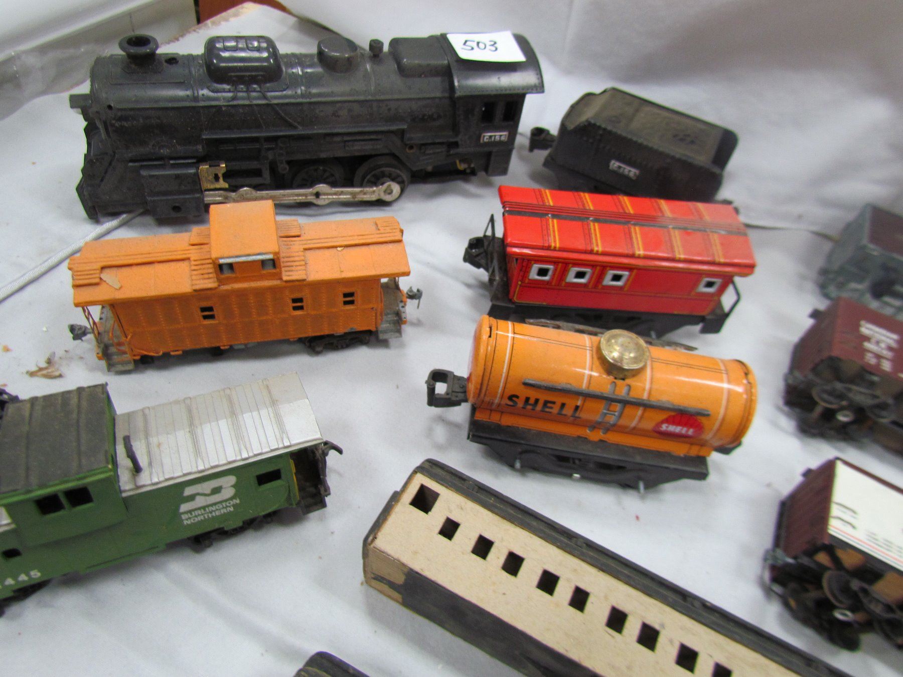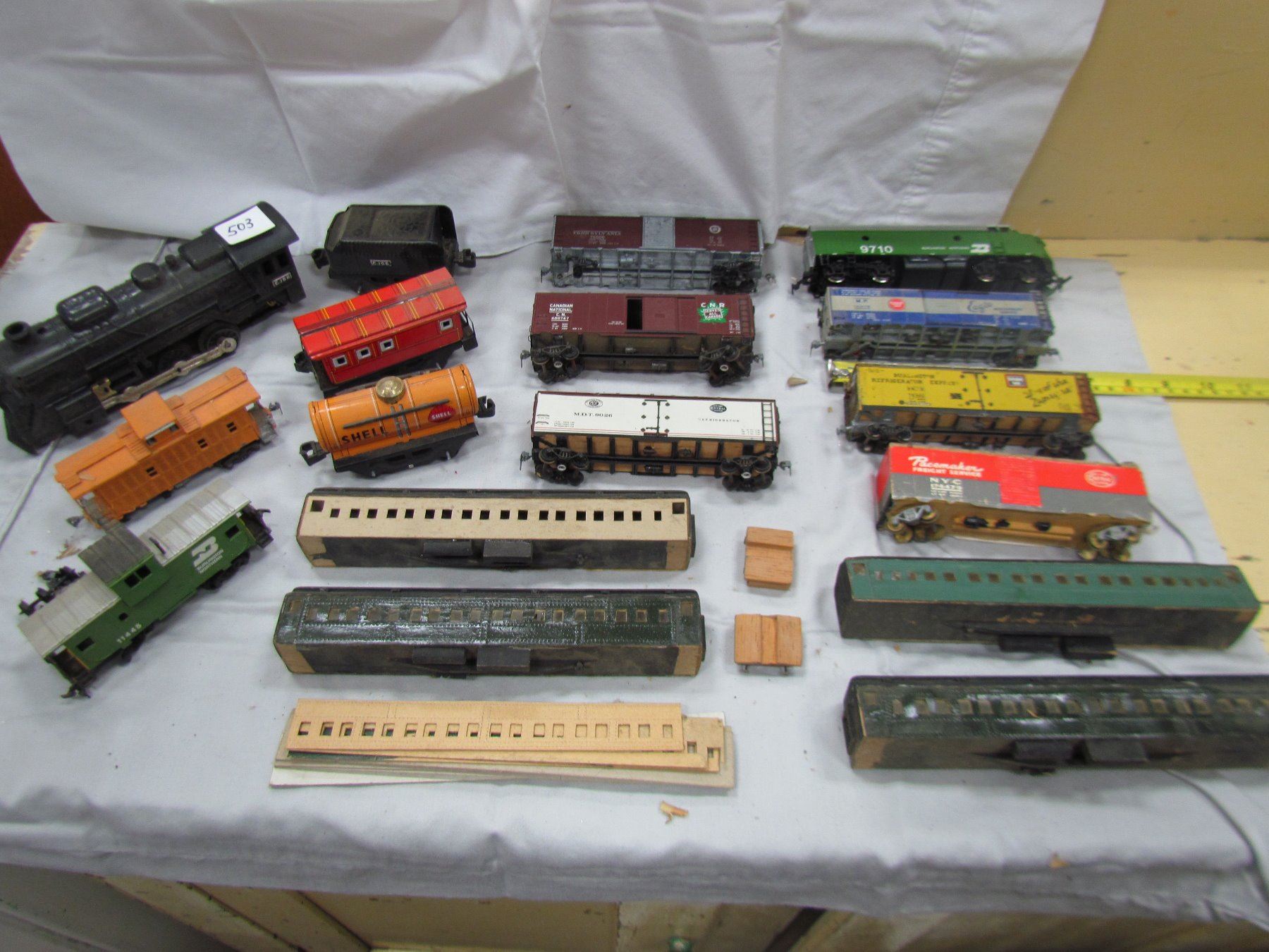 LOT OF 17 TOY TRAIN CARS ( ENGINES, CABOOSE, ETC…)