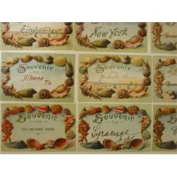 LOT OF 18 SHELL DECORATED SOUVENIR POSTCARDS. From locations including: Syracuse, NY; Old Orchard, ME; Pawling, NY; Carlisle Center, NY; Asbury Park; Washingtoquillo; Elizabethtown; Nashville, TN; New York; Atlantic City, NJ; Grangers Pic-nic; Coney Island; Berwick, PA; Lanesboro, PA; Altoona, PA; Chicago, IL; Erie, PA. All are relief decorated and some are gilt decorated. Seven are postmarked 1907, two are postmarked 1908, and one is postmarked 1911.