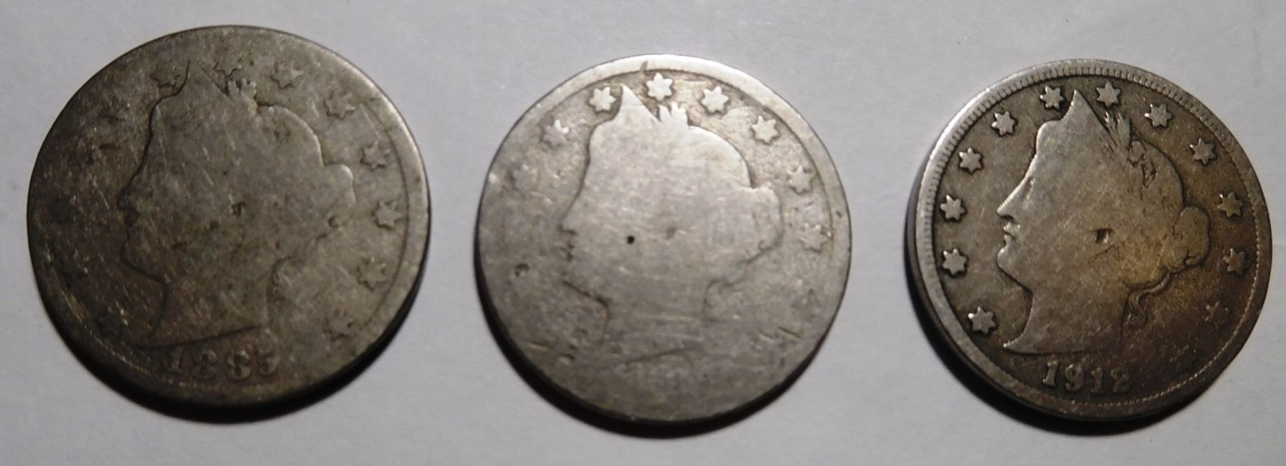 LOT OF 1885 FAIR, 1886 FAIR & 1912-S VG LIBERTY NICKELS (3 COINS)