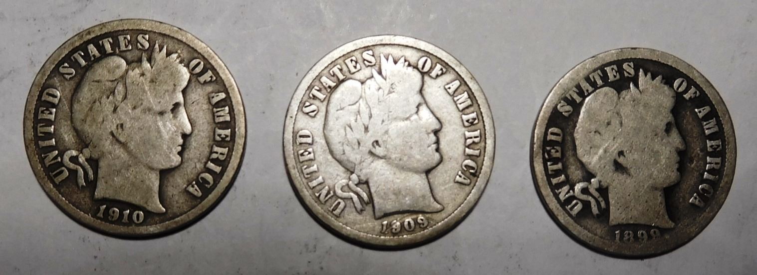LOT OF 1899-O, 1909-O & 1910-S BARBER DIMES G/VG (3 COINS)