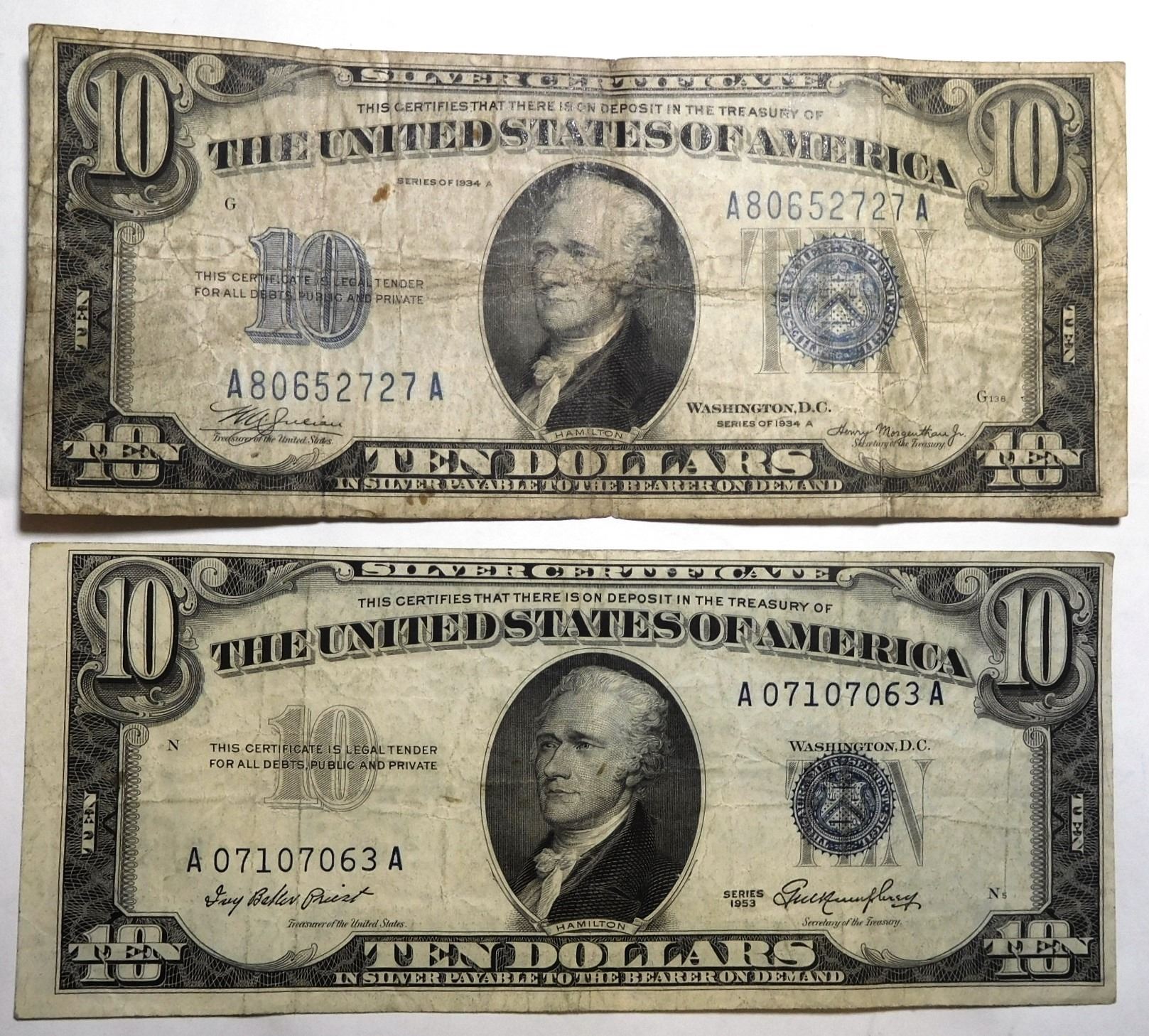 LOT OF 1934-A VG AND 1953 VF $10.00 SILVER CERTIFICATES (2 NOTES)