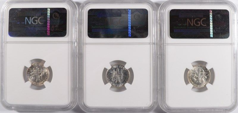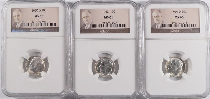 LOT OF ( 2 ) 1960-D AND ( 1 ) 1962 ROOSEVELT DIMES, ALL NGC MS-65