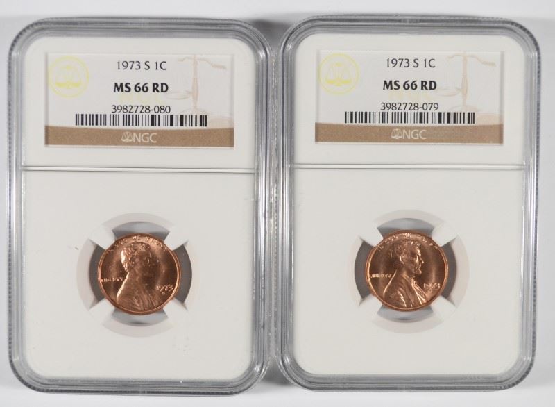 LOT OF ( 2 ) 1973-S LINCOLN CENTS, NGC MS-66 RED RARE! NGC PRICE GUIDE=$325 EACH