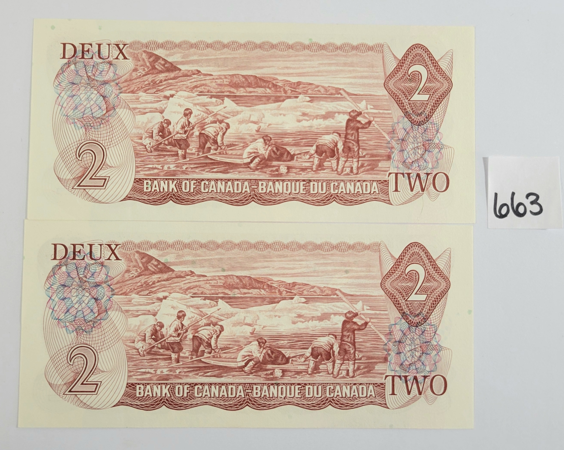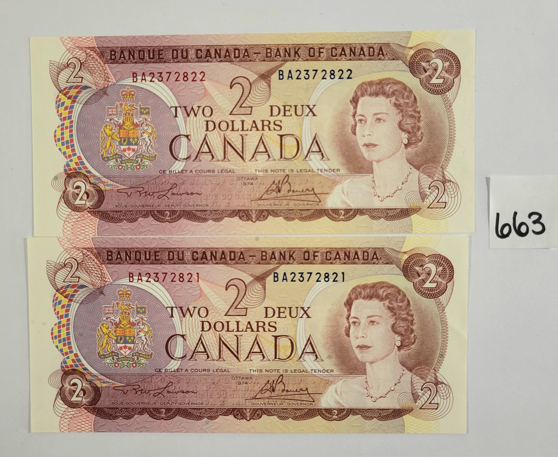 LOT OF 2 - 1974 CDN $2 BANKNOTES - SEQUENTIAL