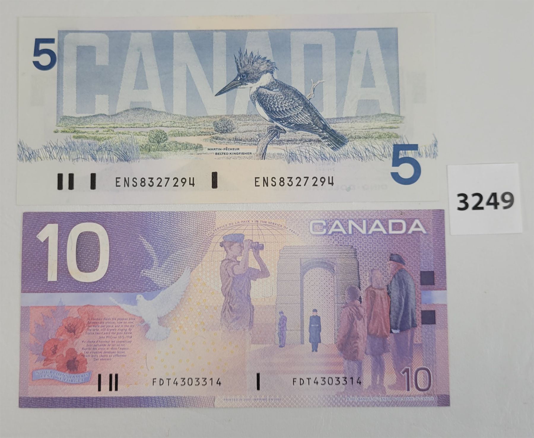 LOT OF 2 - 1986 $5 & 2001 $10 CDN BANKNOTES