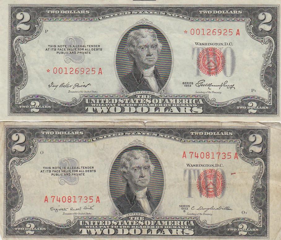 LOT OF 2 $2 RED SEALS WITH STAR1953