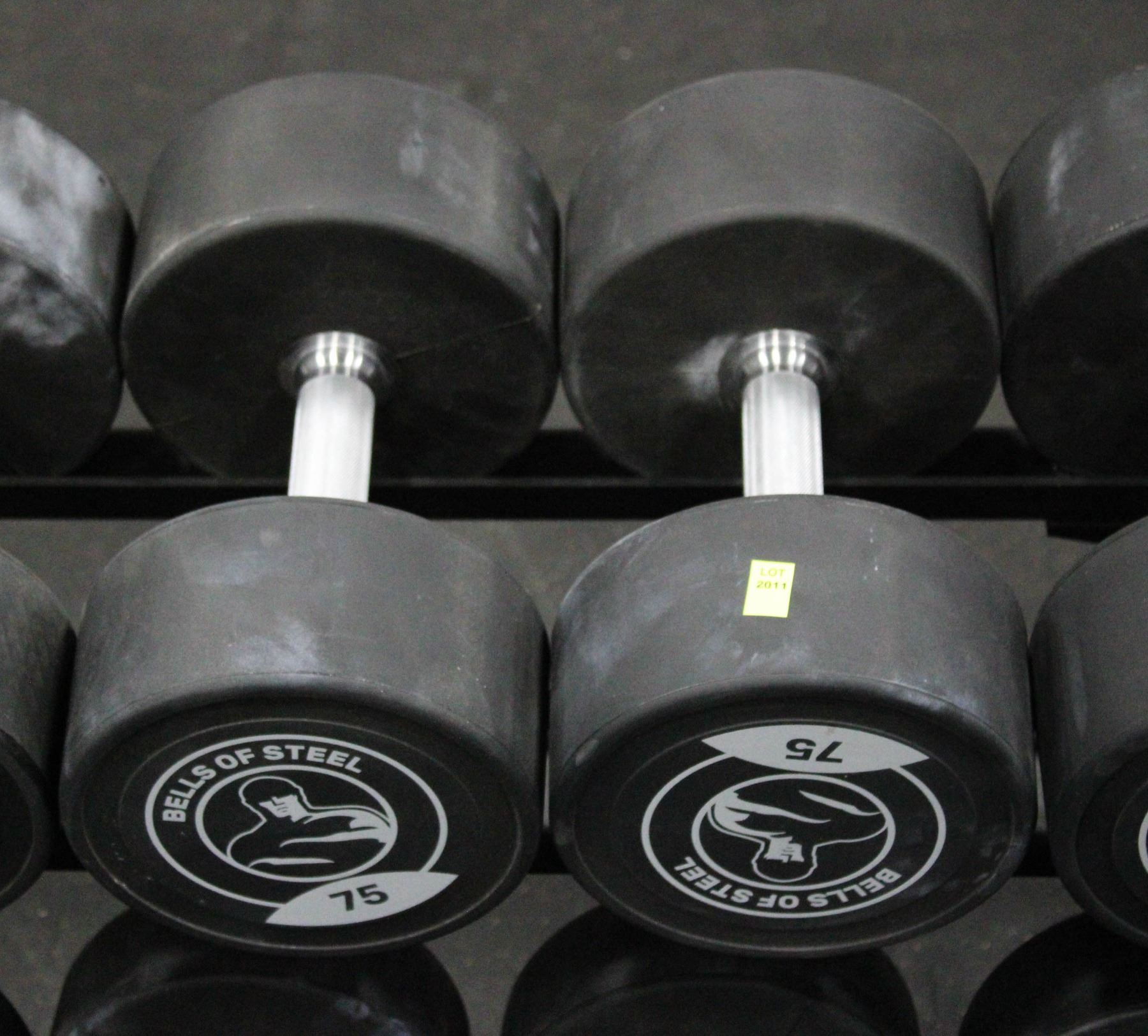 LOT OF 2 75LB BELLS OF STEEL URETHANE DUMBBELLS
