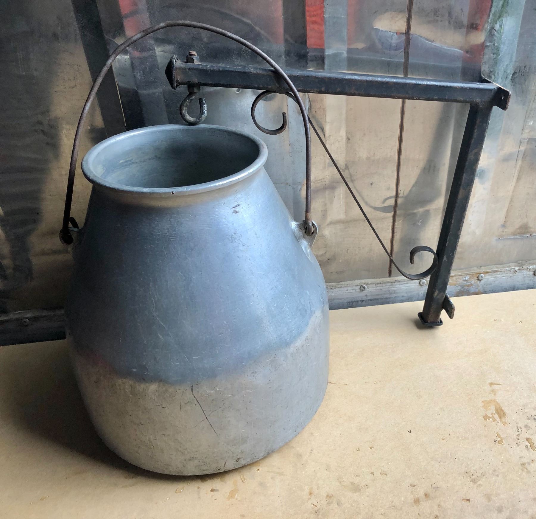 LOT OF 2, ALUMINUM CREAM CAN & WROUGHT IRON PLANT HOLDER BRACKET
