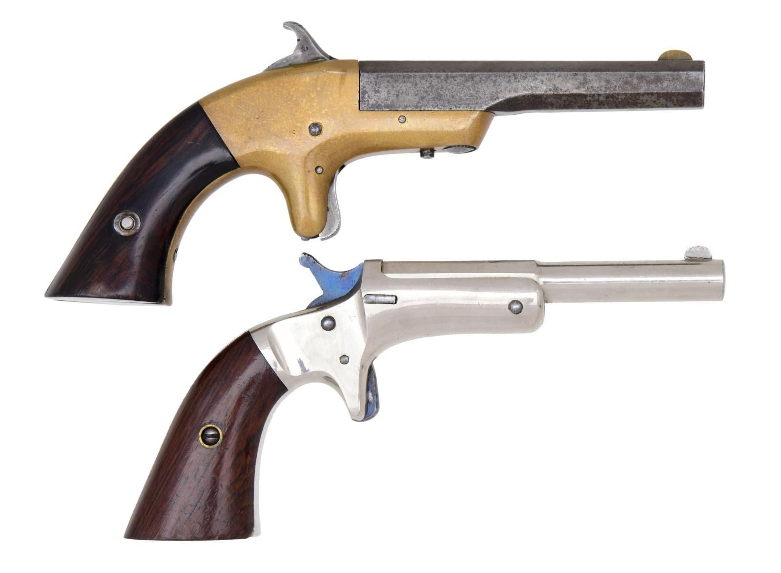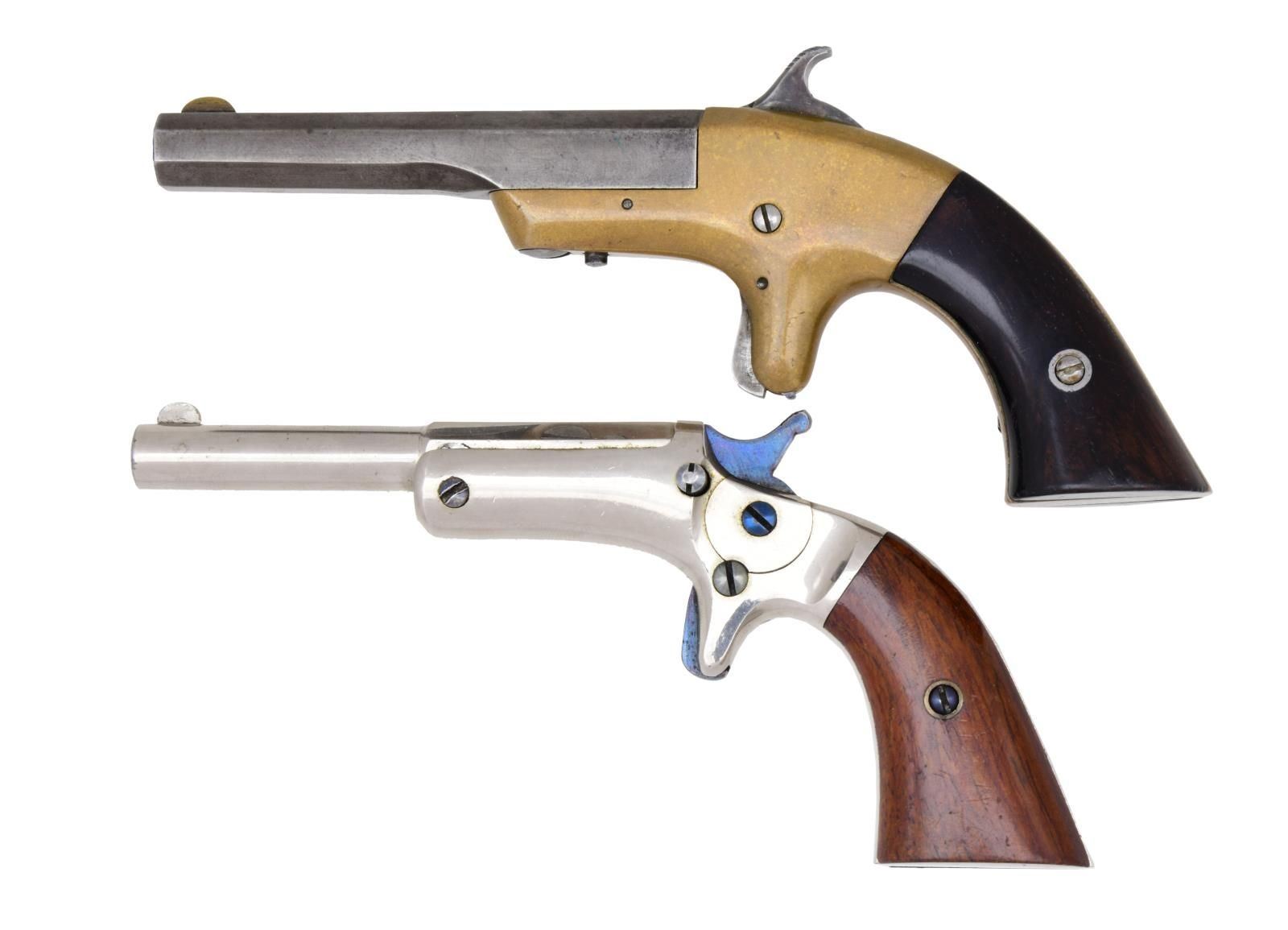PISTOLS. MORGAN & CLAPP SINGLE SHOT DERRINGER. Cal. 28. S# 523 (beneath left grip panel). Bbl. 3 1/2". Single-shot derringer mfg. by Morgan & Clapp. Top of the octagonal bbl. is marked "MORGAN & CLAPP/ NEW HAVEN, CT.". Brass frame with iron bbl., trigger, and hammer. Frame is mounted with 2-piece smooth wood grips. Matching number "523" is marked on the frame and on the interior of the grip panels. CONDITION: brass frame exhibits some scattered marks from handling and storage while retaining a pleasing mellow patina. Iron components exhibit a gray patina, with some areas of light pitting. Bright bore, exhibiting scattered spots of moderate pitting while retaining strong rifling throughout. Grips are very good overall, showing some scattered superficial marks from handling and storage. J. STEVENS & CO. SINGLE SHOT BREAK ACTION PISTOL. Cal. 28. S# 7180 (beneath left grip panel). Bbl. 3 3/8". Single-shot break-action pistol mfg. by J. Stevens & Co. Top flat of the faceted breech is marked with Steven's mfg. and patent information. Frame and bbl. exhibit a nickel-plated finish, with the hammer, trigger, and frame screws exhibiting a nitre blue finish. Frame is mounted with 2-piece smooth wood grips. Matching numbers are present on the frame and bbl., with the grips appearing to be a factory error, with either "7120" or "7190" being handwritten in pencil on the interior of the panels. CONDITION: metal components retain the majority of their original nickel-plated finish, exhibiting scattered superficial handling marks overall. Nitre blue components exhibit varying degrees of wear, with some scattered spots of surface oxidation. Bright bore, exhibiting light to mild pitting while retaining well-defined rifling throughout. Grips exhibit scattered marks and minor impressions from handling and storage, but otherwise remain sturdy and serviceable. (01-24338/MLW). ANTIQUE. $600-800.