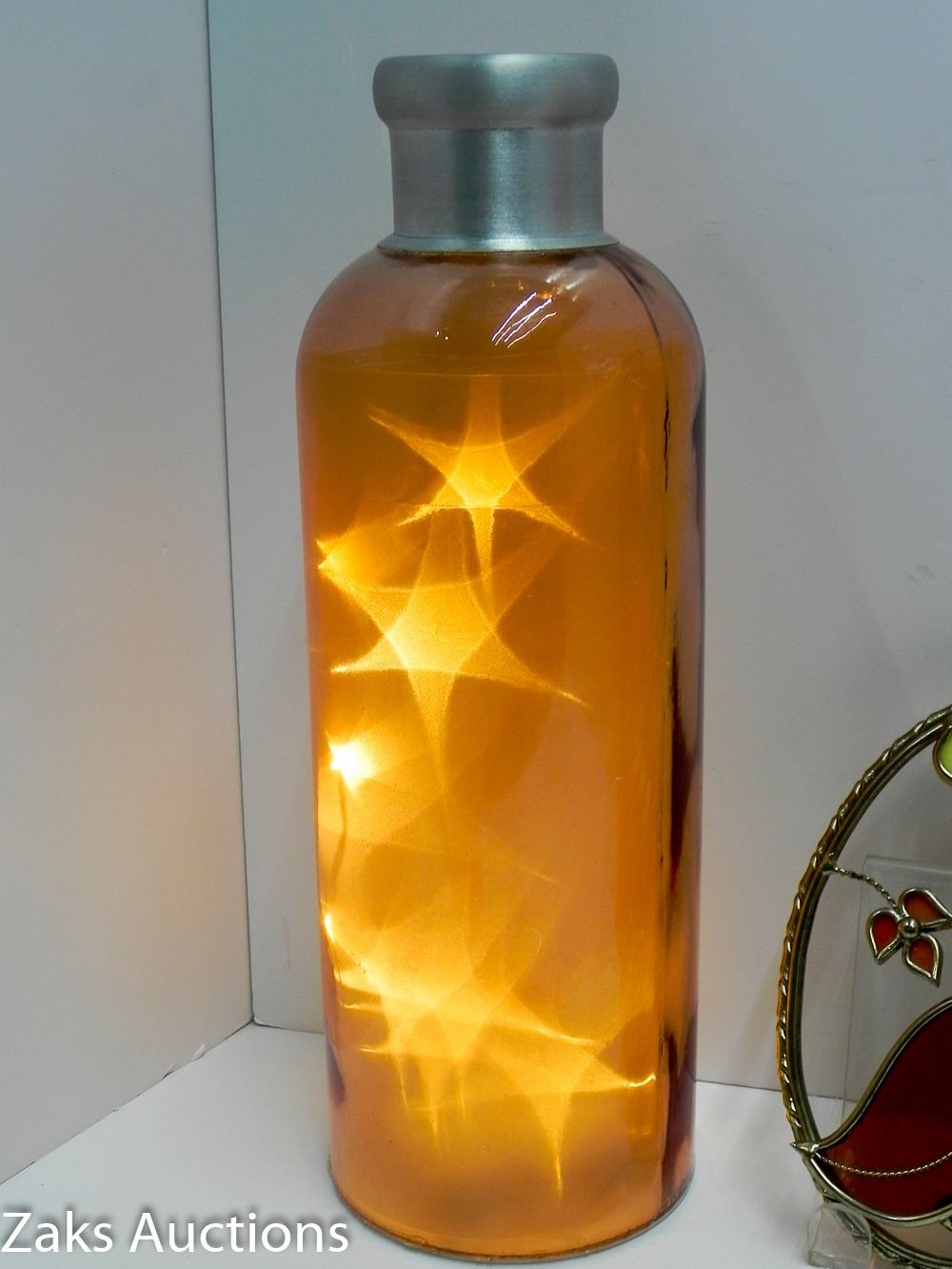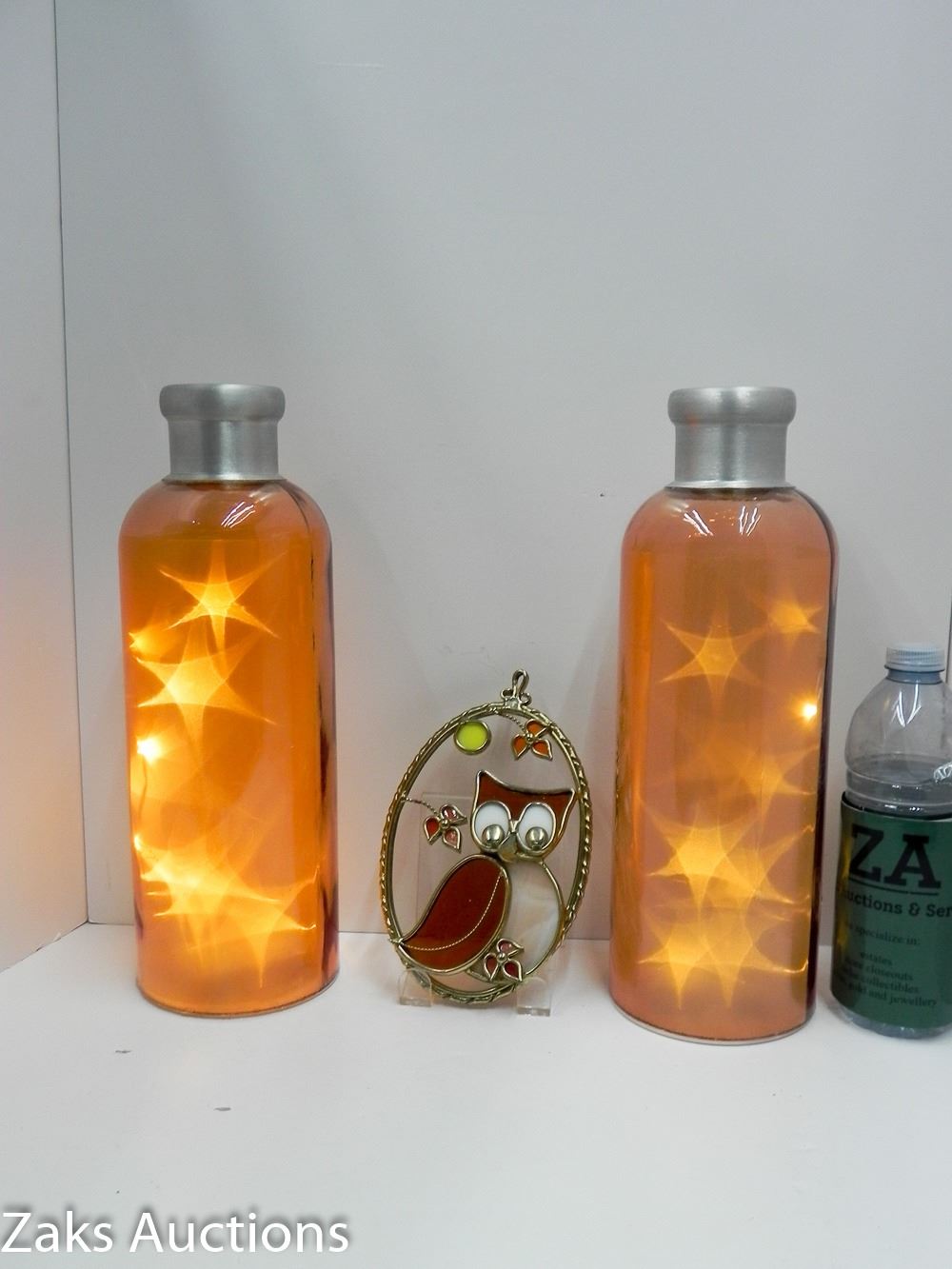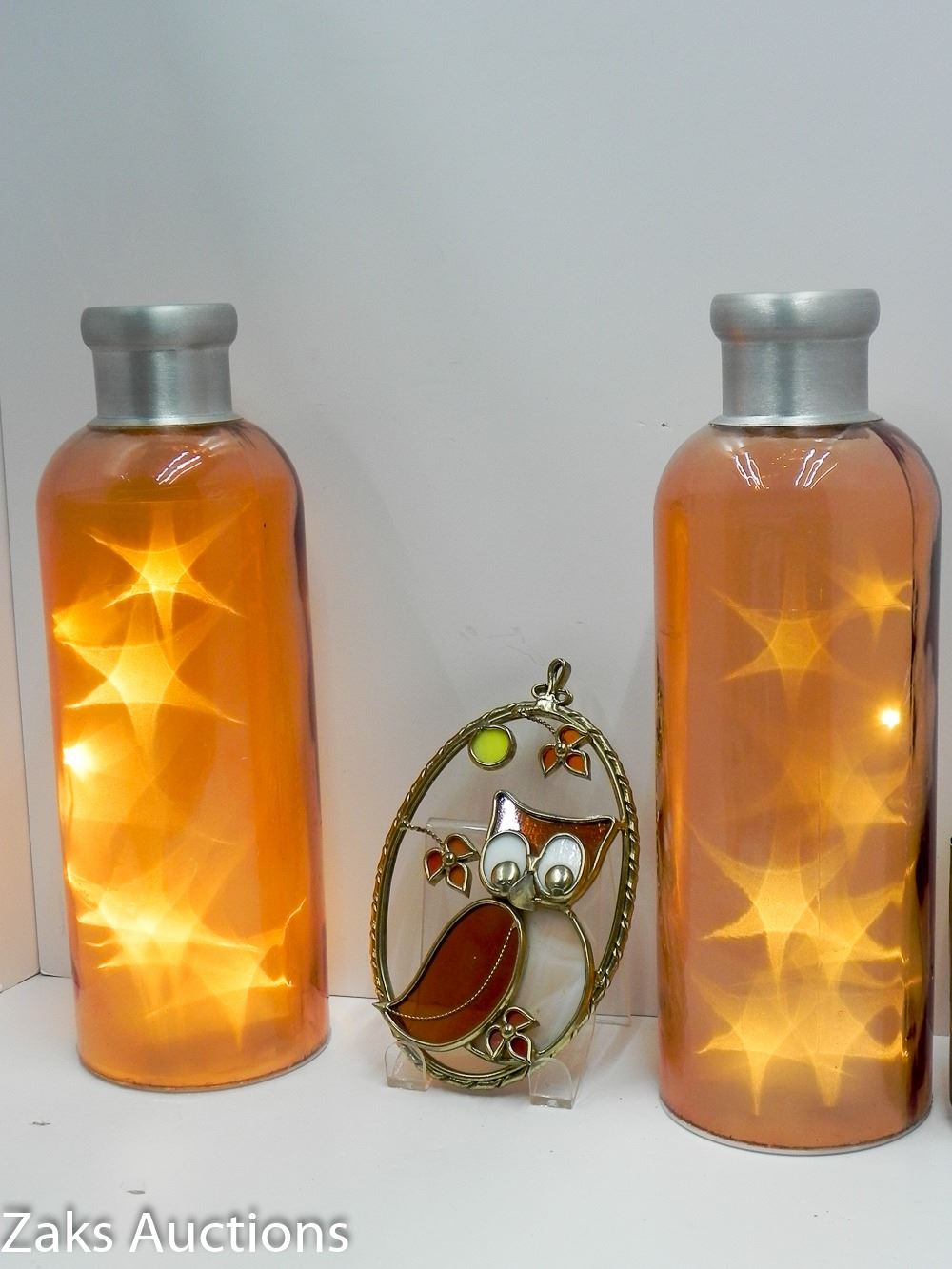 LOT OF 2 BATTERY OPERATED DECOR (WORKING) AND ADORABLE OWL GLASS WINDOW DECOR. THE ONE LIGHTED ACCENT, THE BASE IS LOOSE.