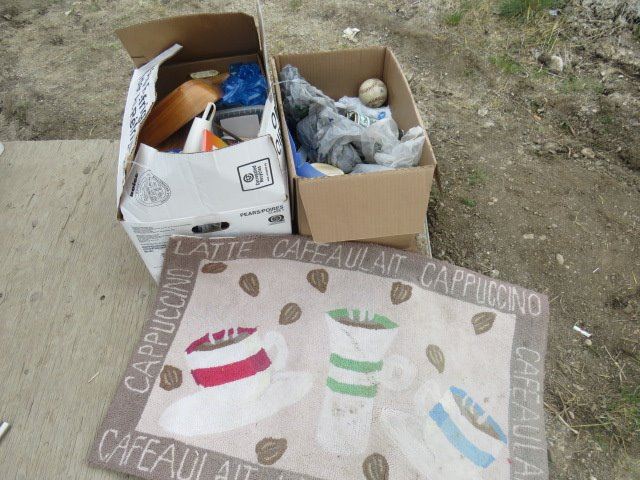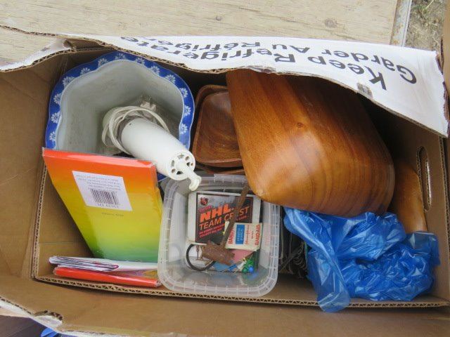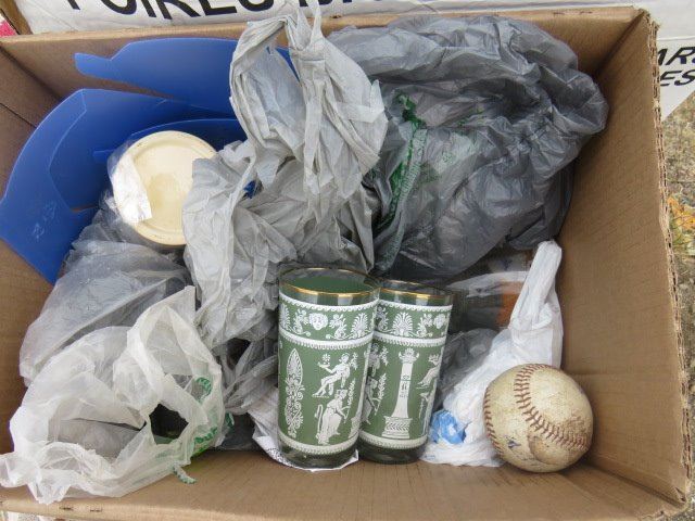 LOT OF 2 BOXES MISC. HOUSE HOLD ITEMS (WOODEN BOWL SET, GREEK GLASSES, RUG)