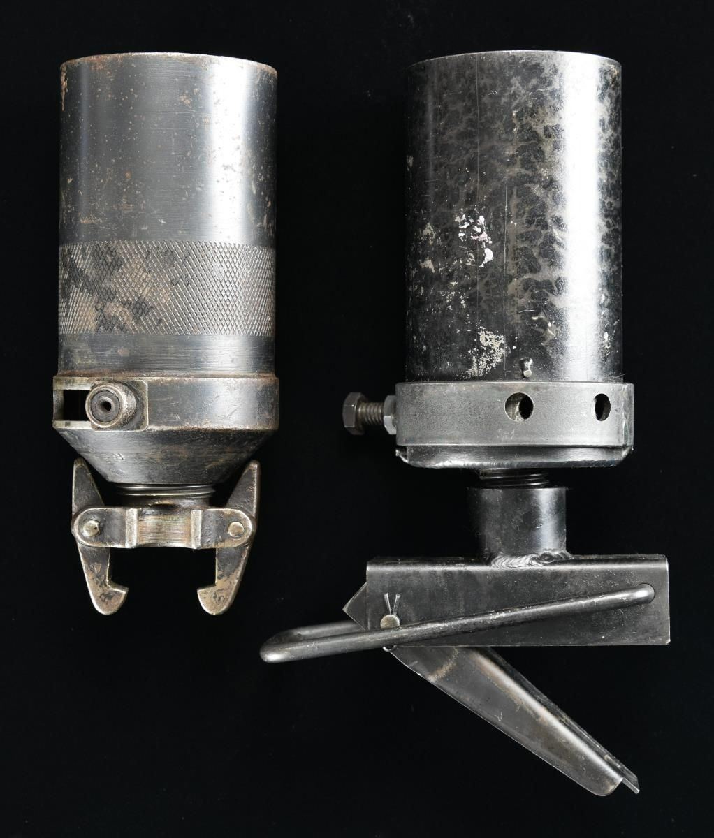 This lot consists of two cup grenade launchers for British military rifles. 1. P14 GRENADE LAUNCHER. Grenade launcher w/ attachment fixtures, No visible markings. Suncorite black enamel finish. CONDITION: Metal shows scattered flaking & some light oxidation. 2. SMLE CUP LAUNCHER. Clamp mount present. RFI marked denoting Ishapore mfg. Base is marked "GCE" w/ broad arrow. Suncorite black enamel finish. CONDITION: metal shows scattered oxidation, flaking & silvering. (02-19821/MJC). $600-1000.