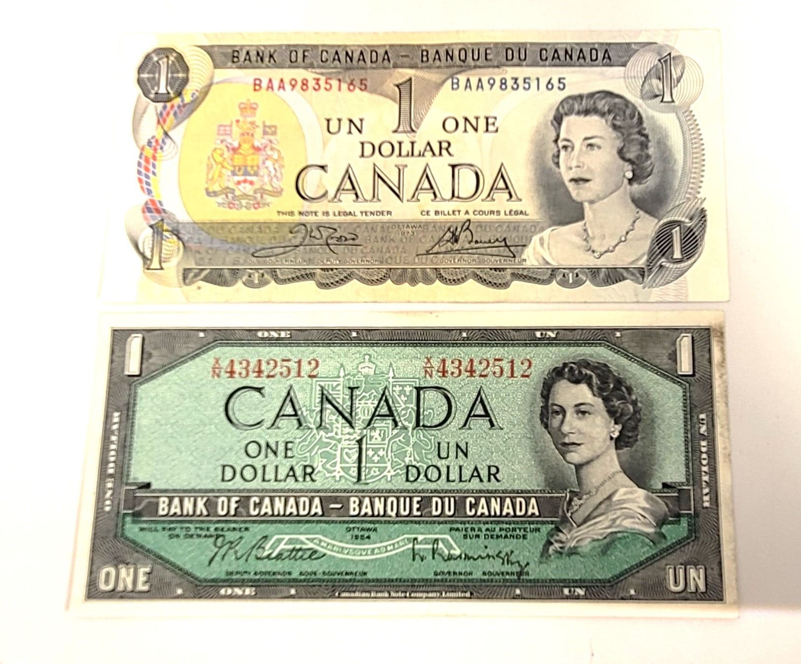 LOT OF 2 CANADIAN $1.00 BANKNOTES, 1974 &