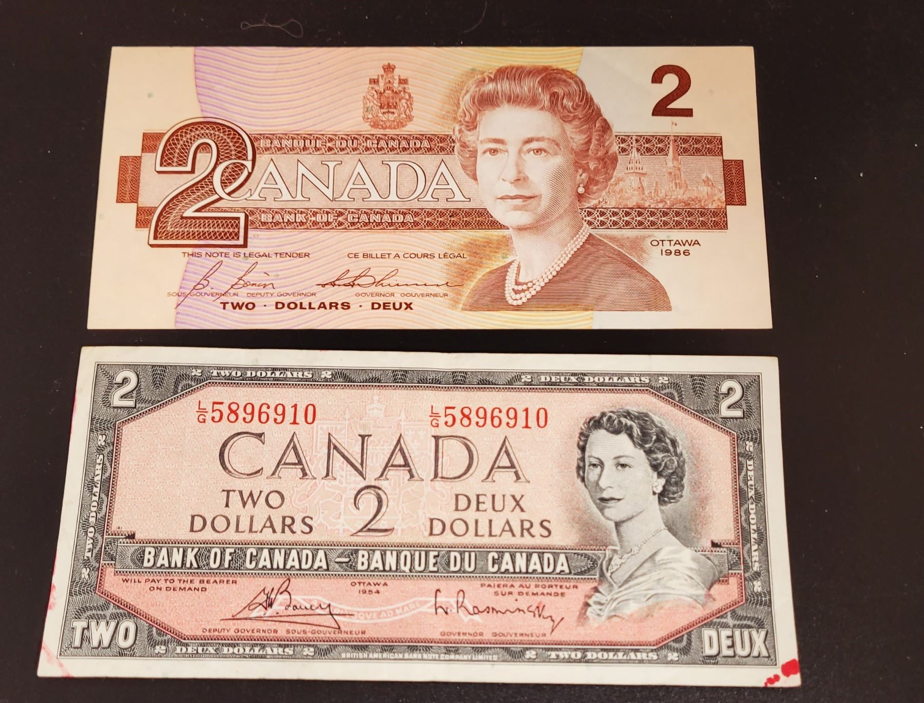 LOT OF 2 CANADIAN $2.00 BANKNOTES, ONE