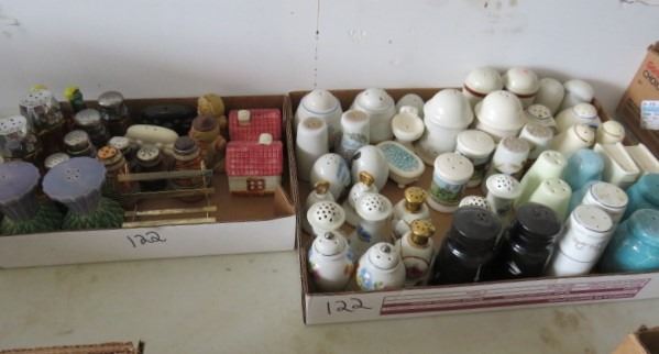 LOT OF 2 CARDBOARD TRAYS OF SALT AND PEPPER SHAKERS (CORN FLOWER, ETC)