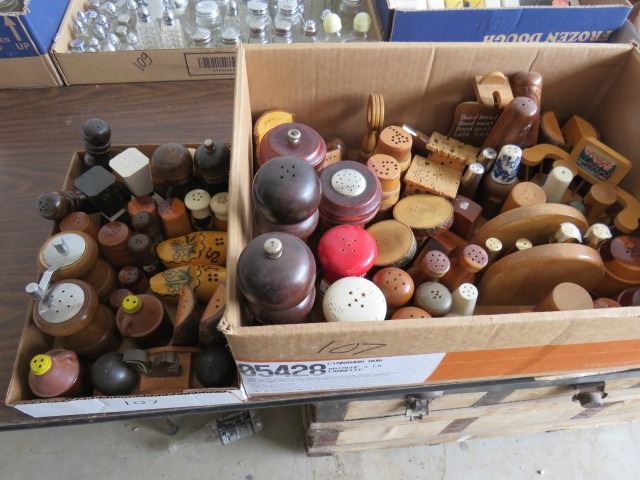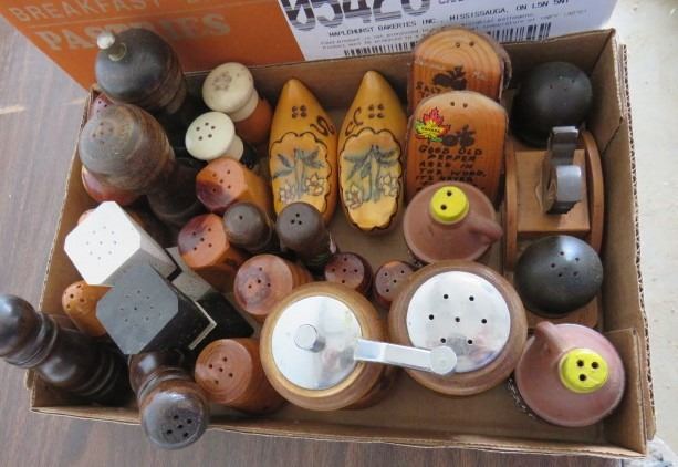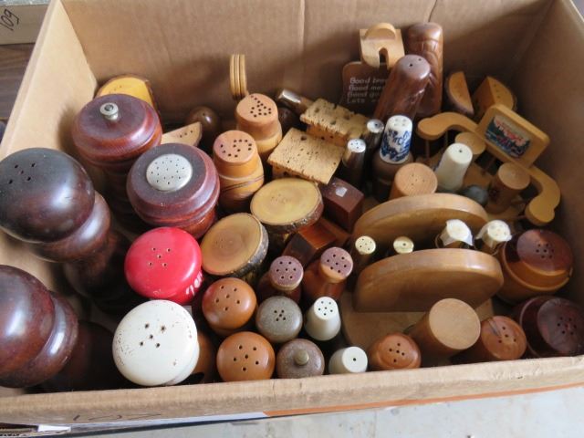 LOT OF 2 CARDBOARD TRAYS OF SALT AND PEPPER SHAKERS (WOOD)