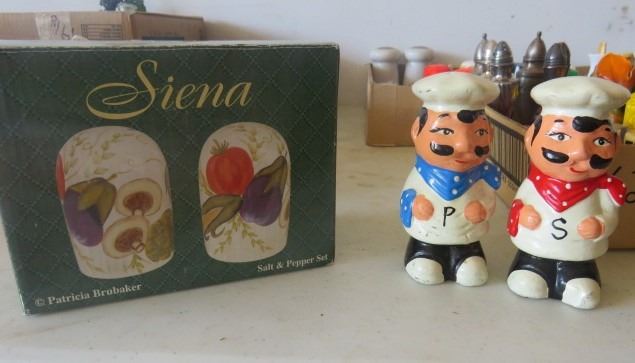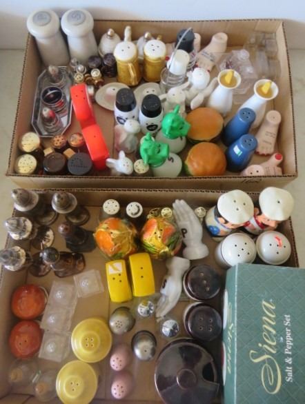 LOT OF 2 CARDBOARD TRAYS OF SALT AND PEPPER SHAKERS