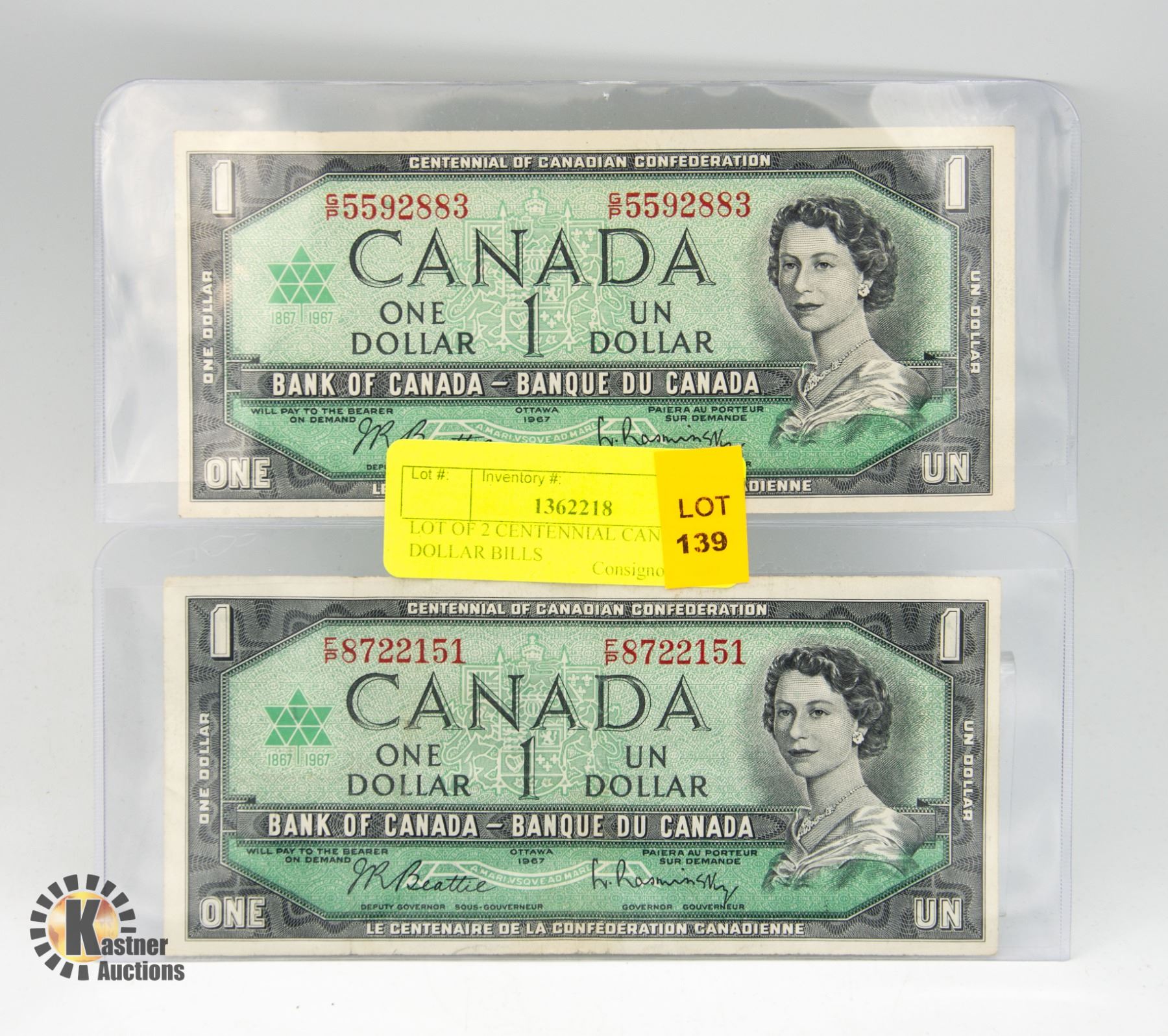 LOT OF 2 CENTENNIAL CANADIAN 1 DOLLAR BILLS