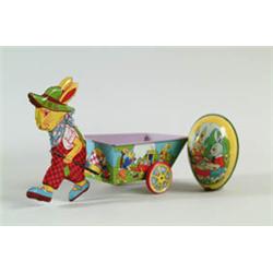 Lot # 1021 LOT OF 2 CHEIN EASTER TOYS. 1) Large tin easter egg with very nice colorful graphics of rabbits at play. 2) All tin rabbit pulling cart with vibrant images of rabbits gathering eggs. SIZE: Largest is 12" l. CONDITION: 1) Egg shows some wear on underside, otherwise very clean. 2) Near excellent. 1-28792 (100-200)