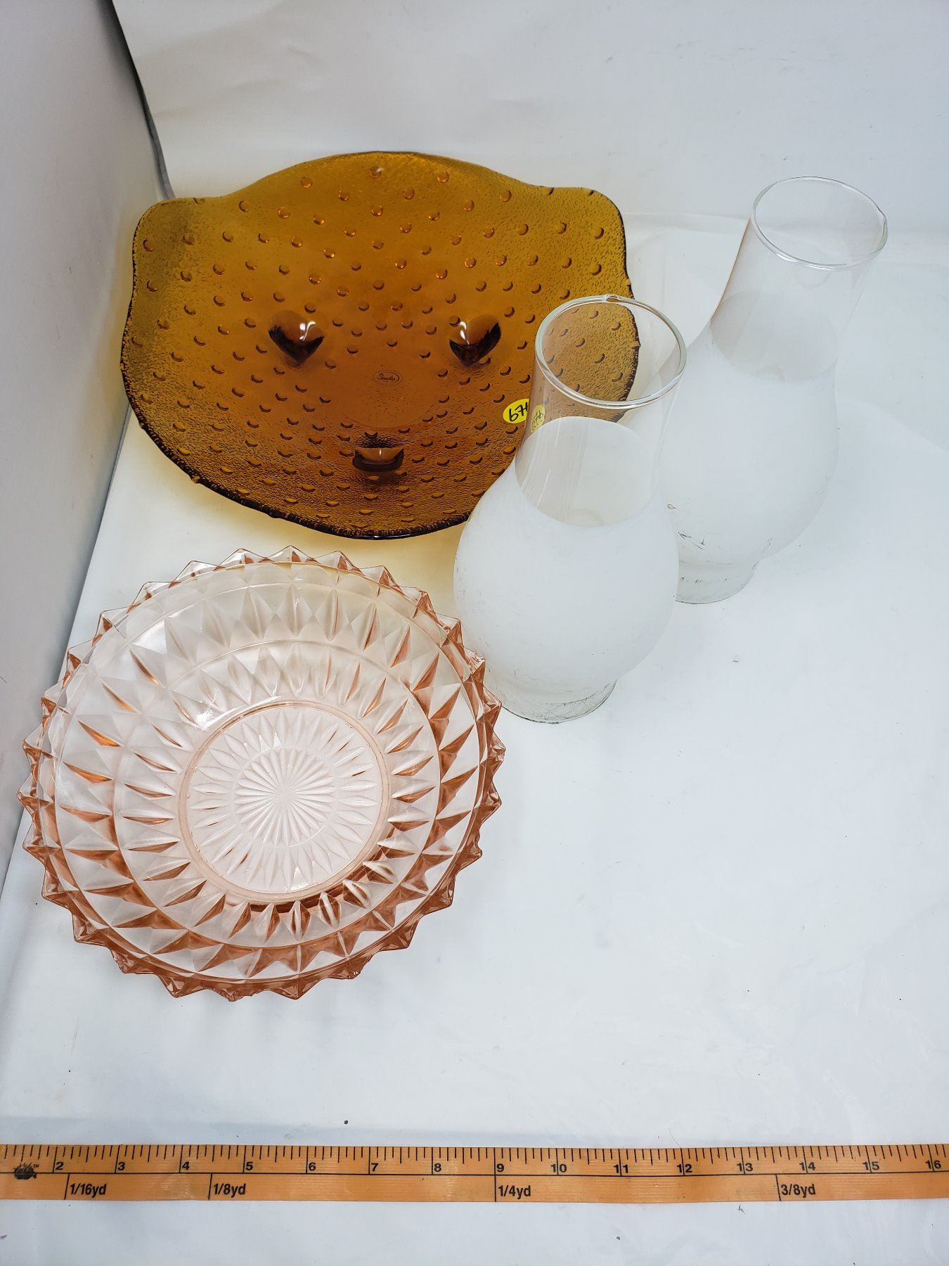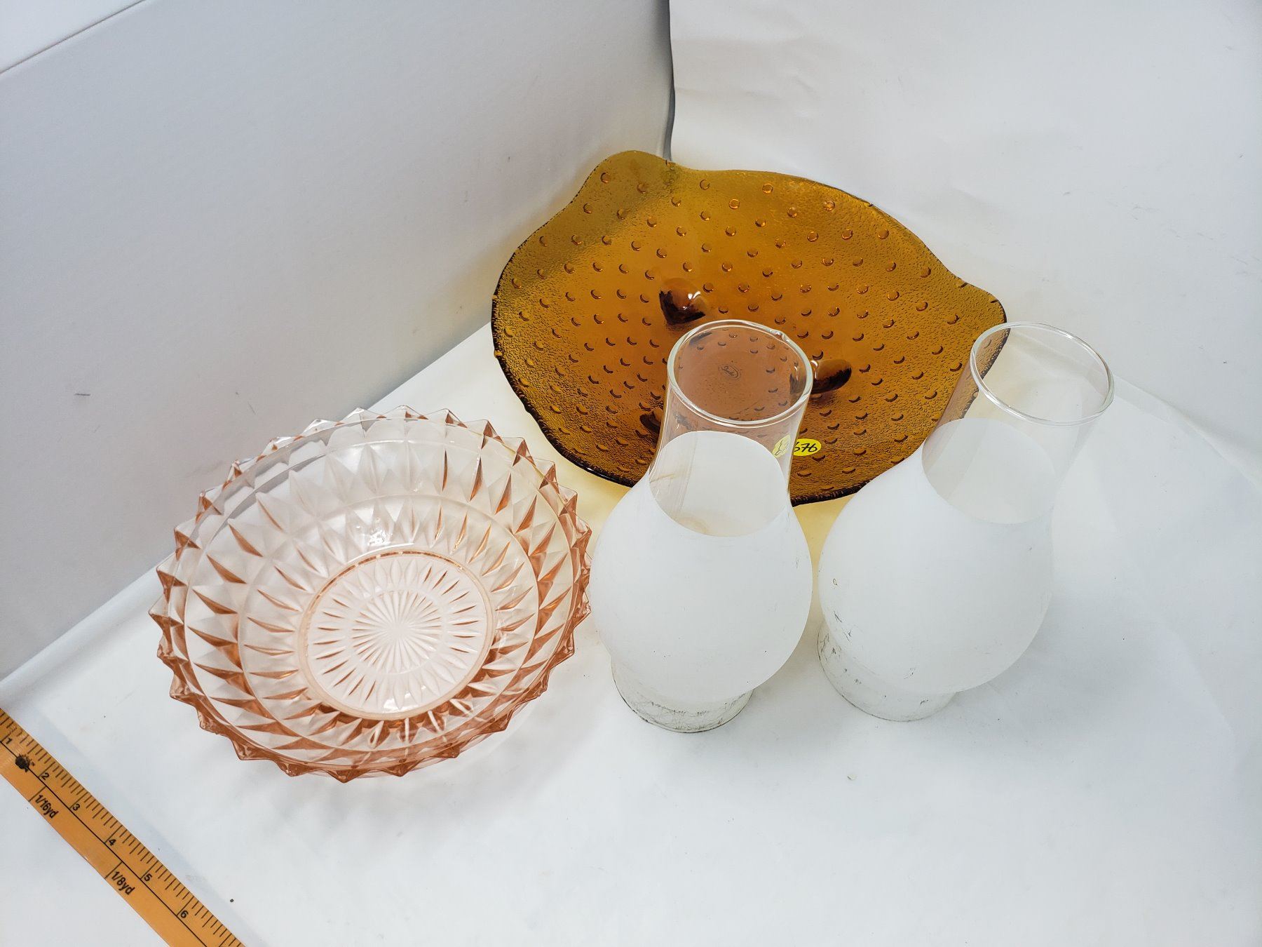 LOT OF 2 COLORED BOWLS (PINK & AMBER, 2 LAMP CHIMNEYS)