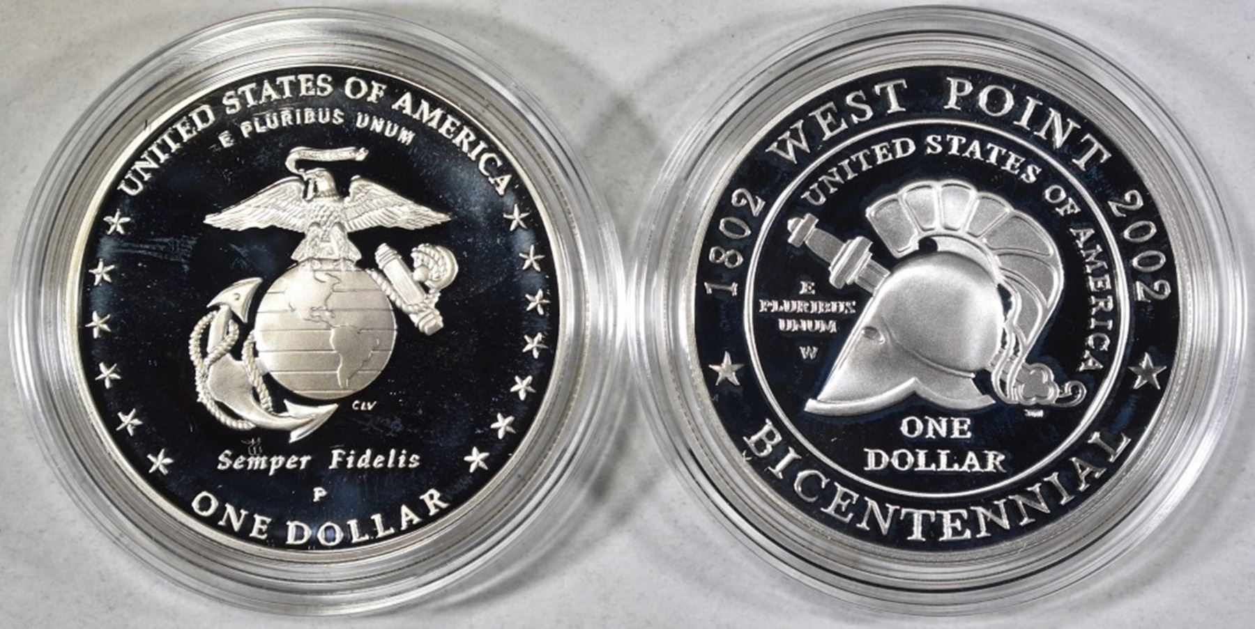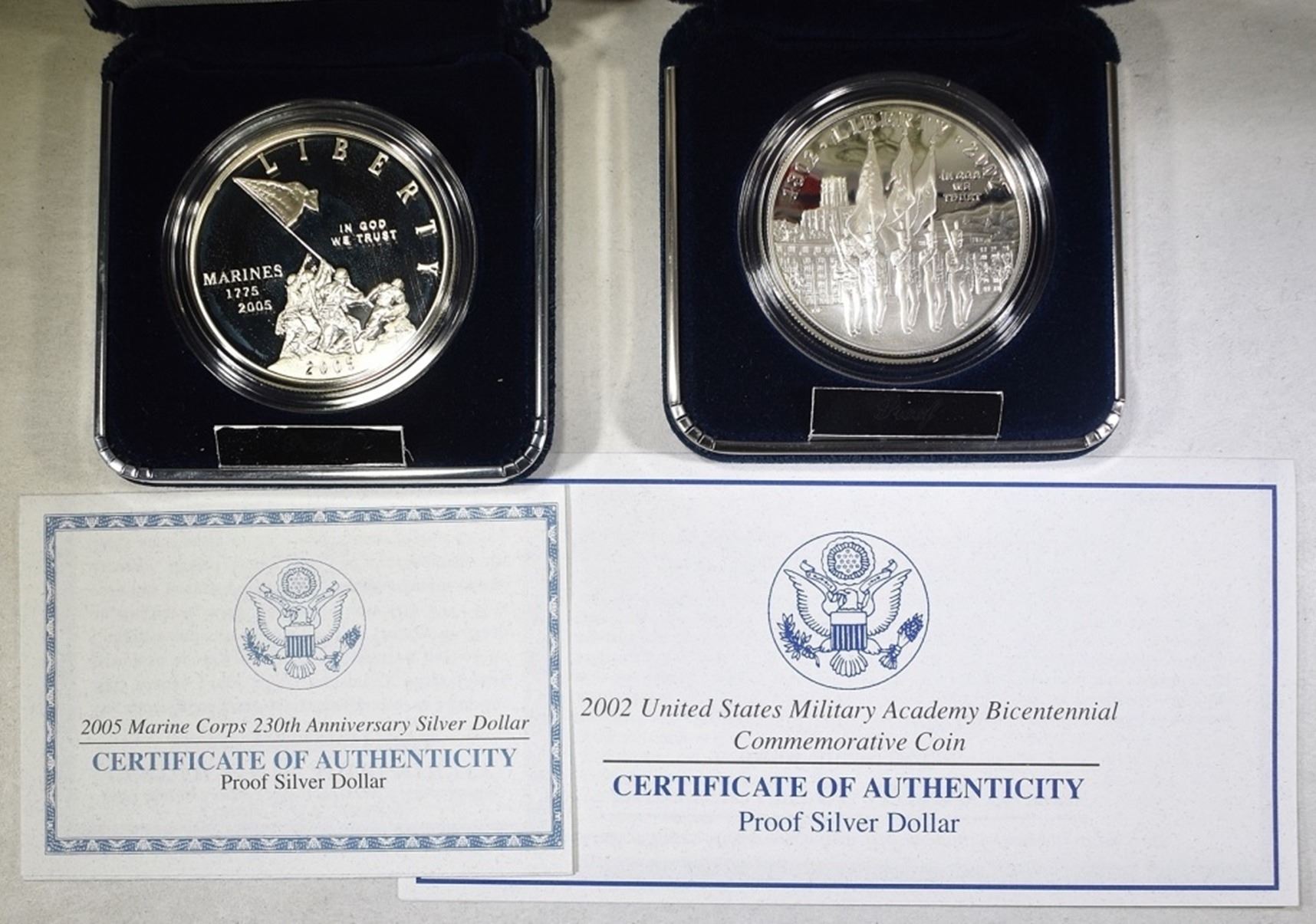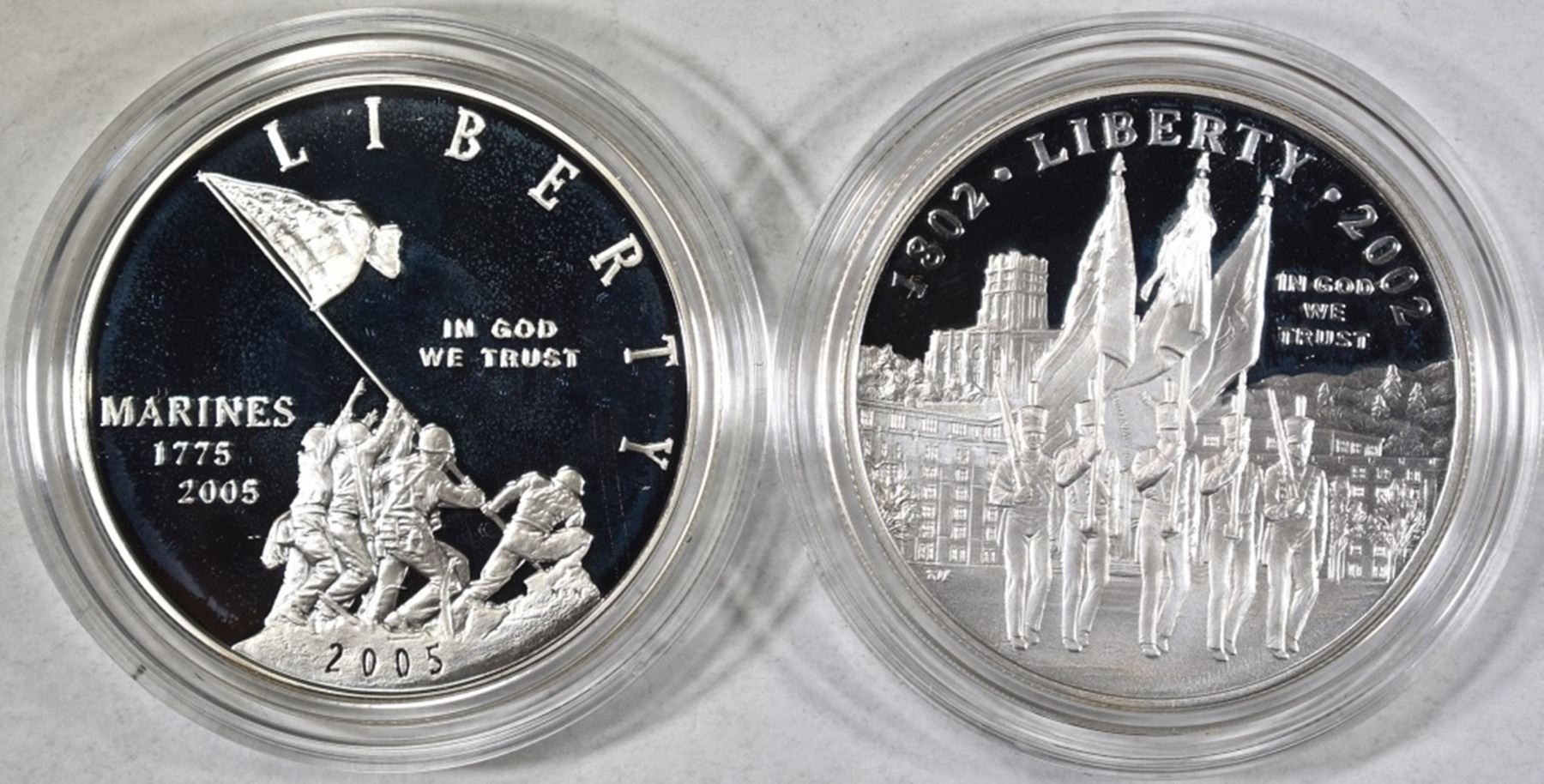 1-2002 MILITARY ACADEMY PROOF SILVER DOLLAR & 1-2005 MARINE CORP PROOF SILVER DOLLAR ESTIMATE $85 - $95.