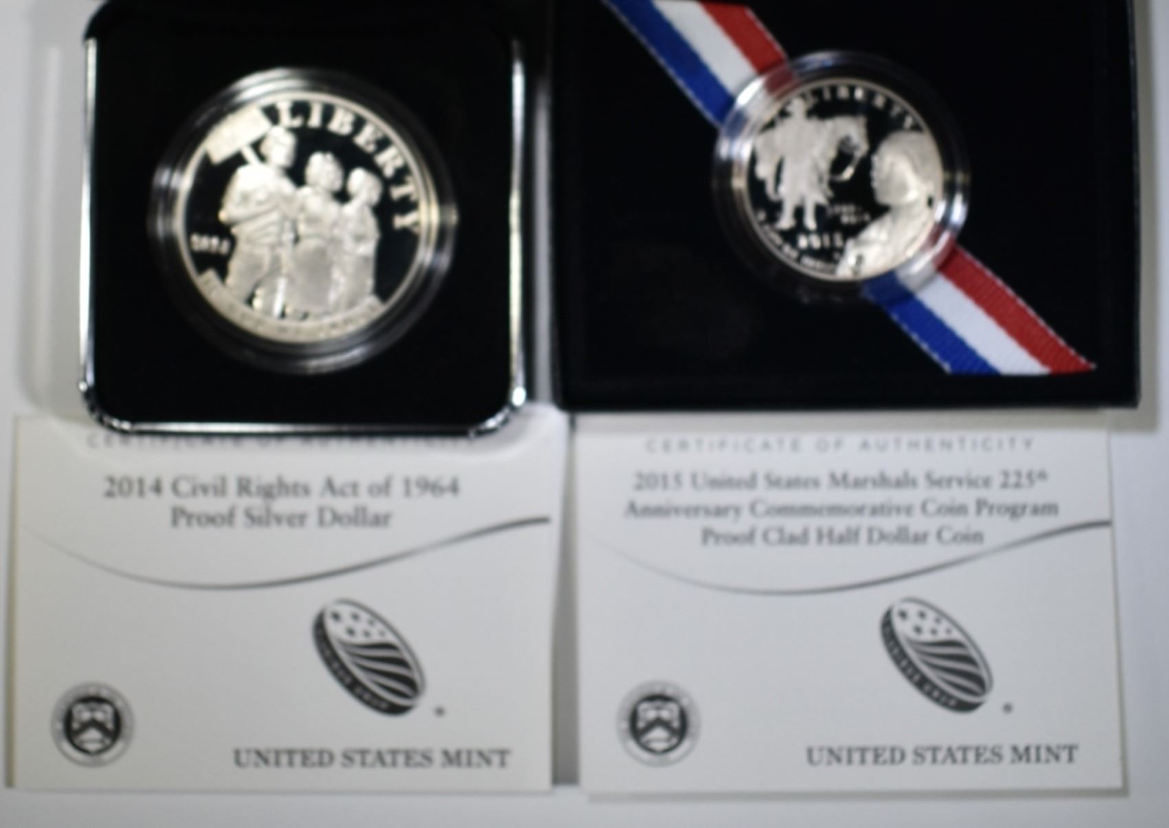2014 CIVIL RIGHTS PROOF SILVER DOLLAR & 2015 U.S. MARSHALS PROOF CLAD HALF DOLLAR. ESTIMATE $75 - $100.