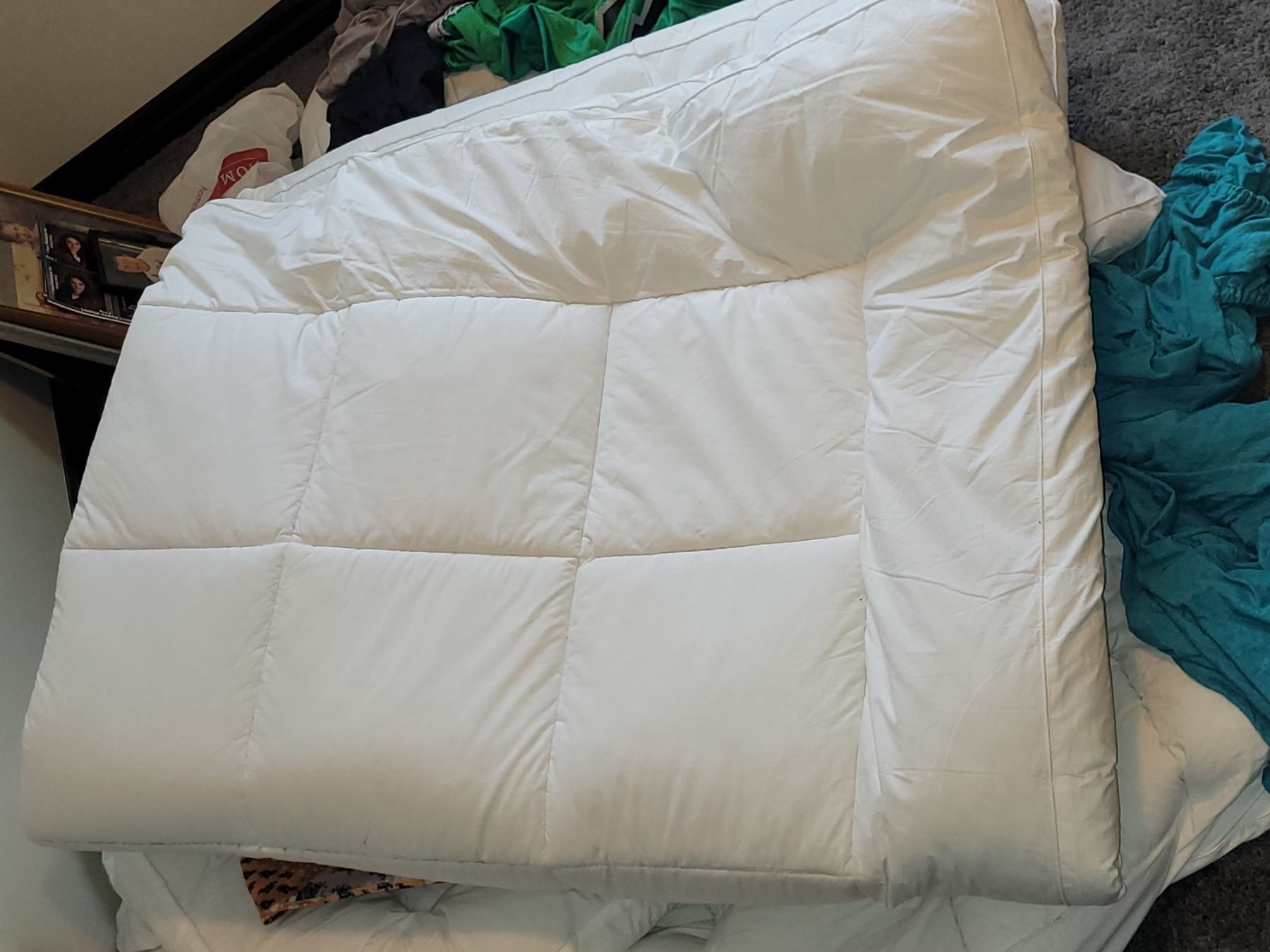 LOT OF 2 DUVET MATTRESS TOPPERS. KING SIZE AND DOUBLE. RECOMMEND CLEANING, AS WITH ALL PERSONAL LINEN. AS IS WHERE IS. NO REFUND. NO RETURNS