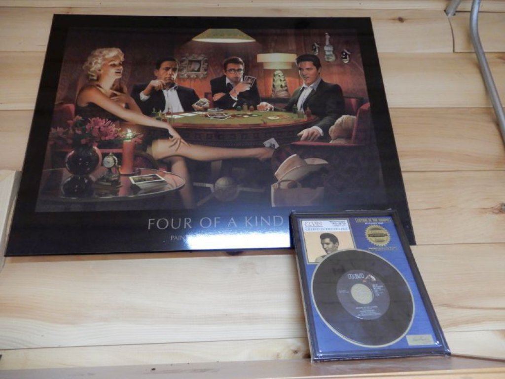 LOT OF 2 ELVIS PRESLEY PICTURES FRAMED 45 RPM RECORD FRAMED FOUR OF A KIND PAINTING WITH ELVIS PRESLEY, MARILYN MONROE, AL PICHINO & HUMPHREY BOGART 32" X 24" UPPER OFFICE LOCATION: UPPER OFFICE