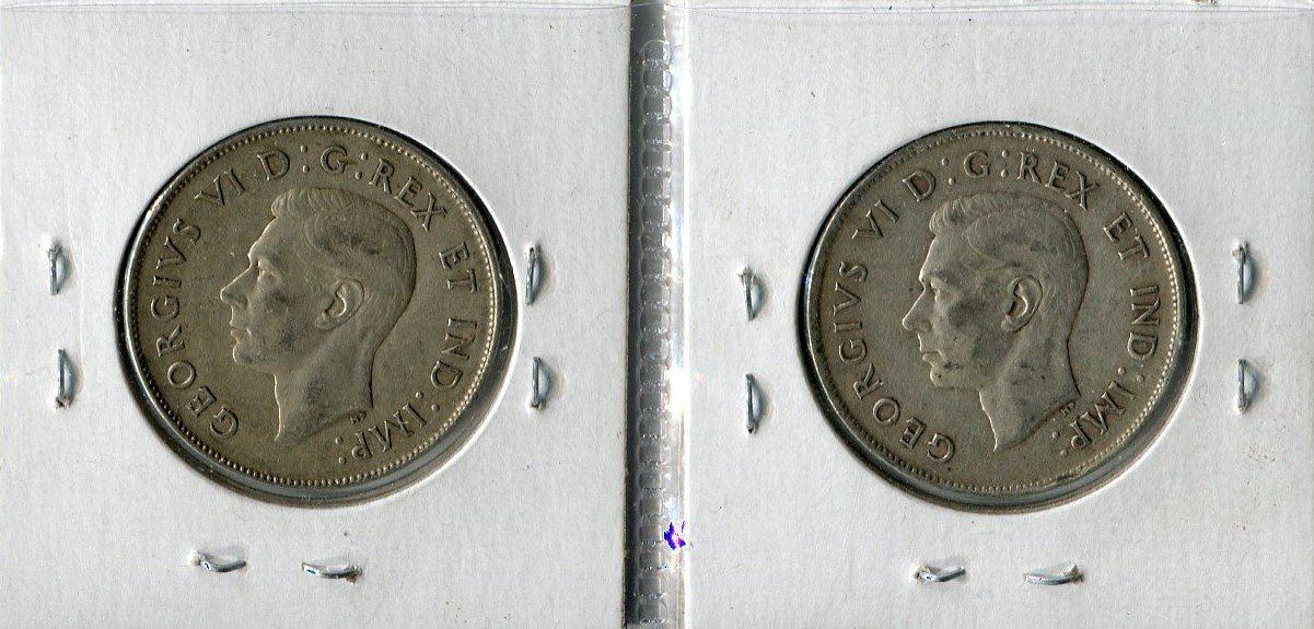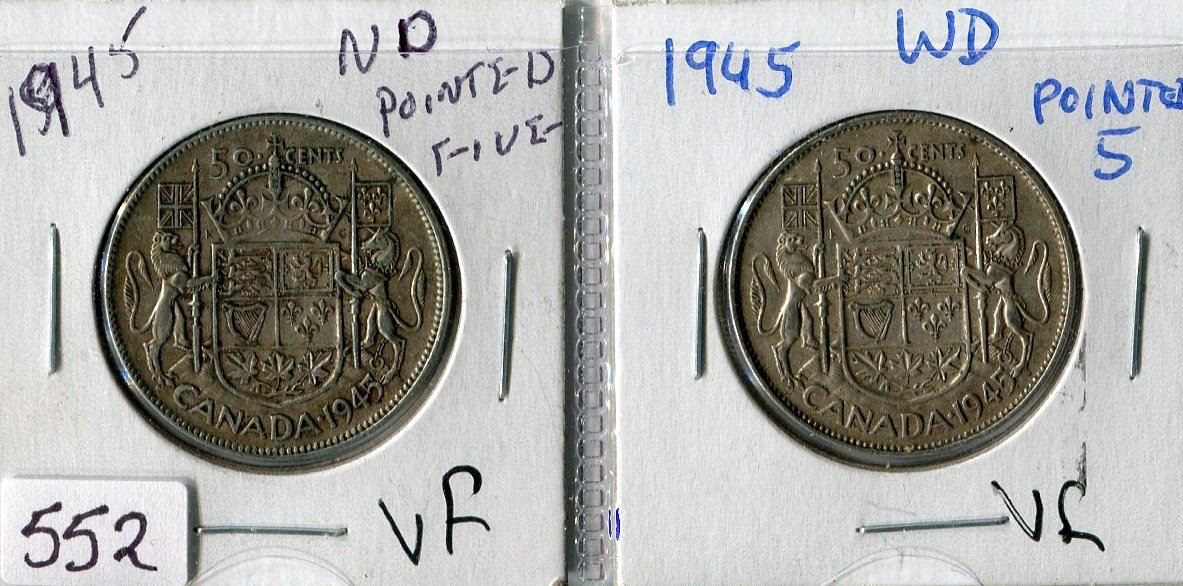 LOT OF 2 FIFTY CENT COINS (CANADA) *1945* (WIDE DATE & NARROW DATE) *POINTED 5*