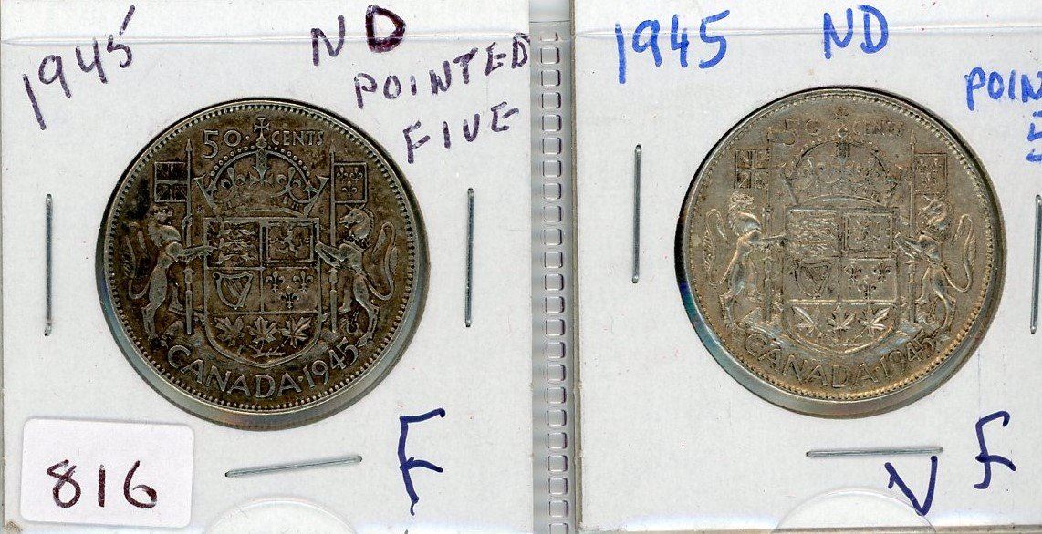 LOT OF 2-FIFTY CENT COINS (CANADIAN) *2 X 1945* (SILVER) *POINTED 5*