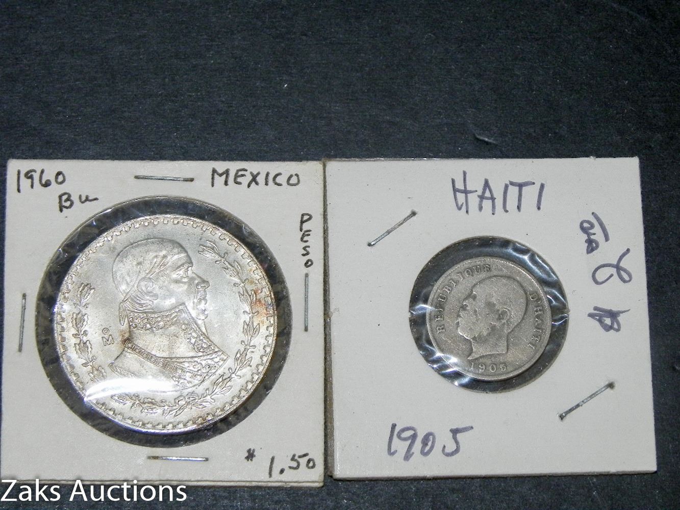 LOT OF 2 FOREIGN COINS. 1960 MEXICO PESO AND 1905 HAITI COIN