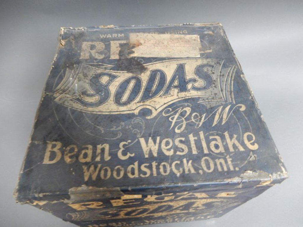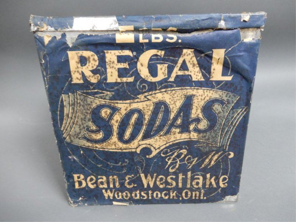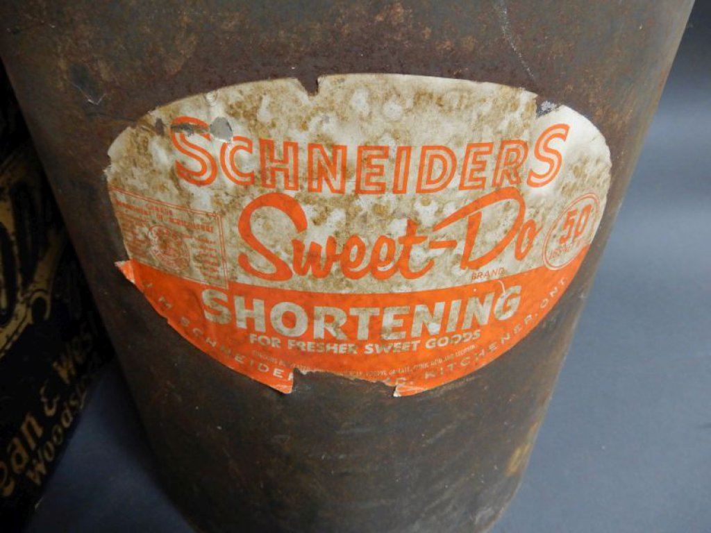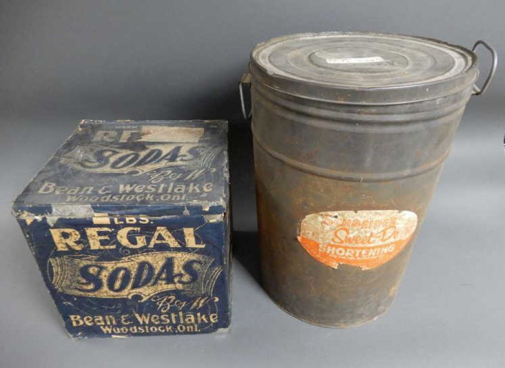 LOT OF 2 GENERAL STORE COLLECTIBLES SCHNEIDERS SWEET-DO 50 LB. SHORTENING CAN WEAR ON LABEL REGAL SODAS - BEAN & WESTLAKE - WOODSTOCK, ON.,- PAPER LABEL- SHOWS WEAR LOCATION: LOWER LEFT