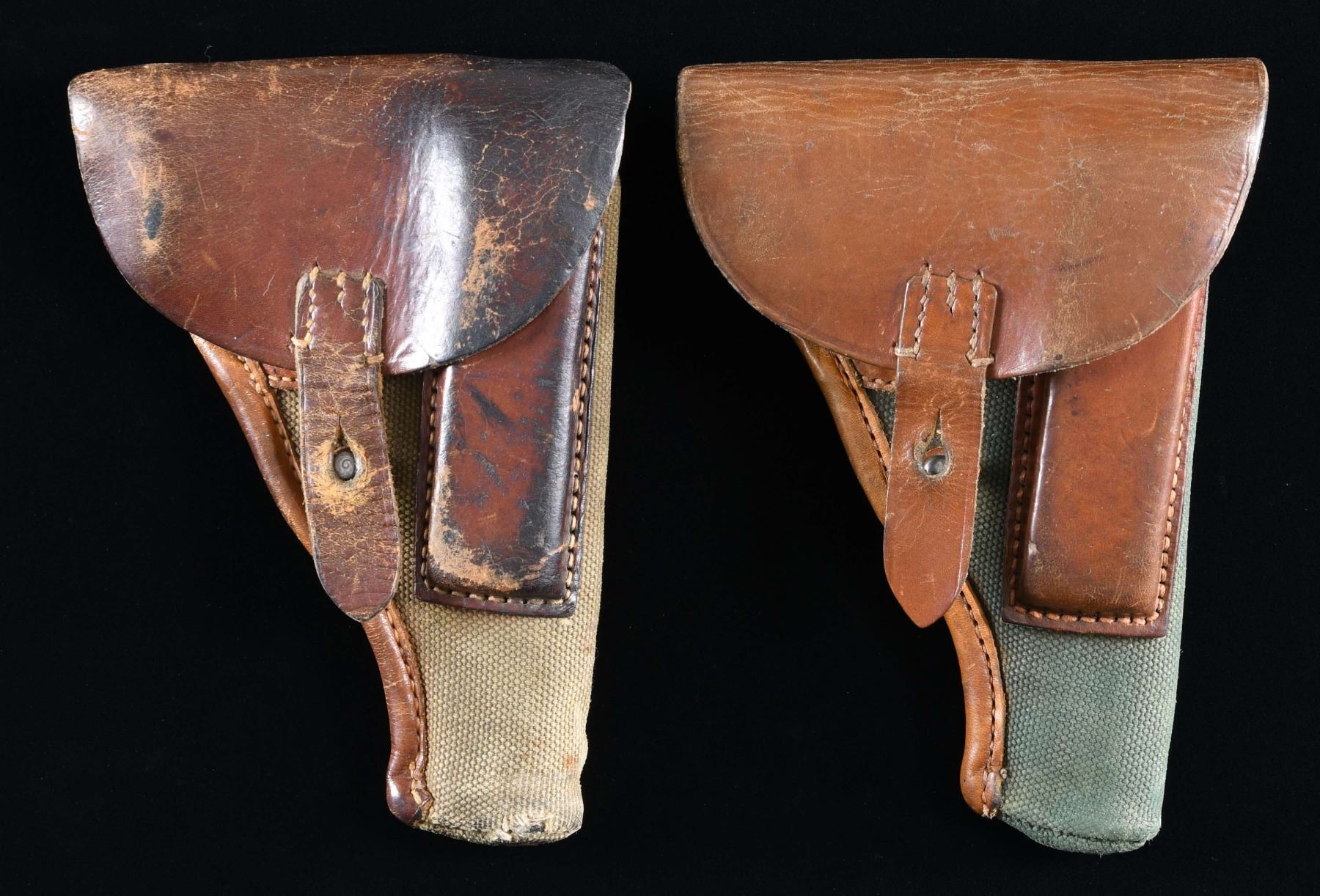 MODEL 37 PISTOL HOLSTERS. Lot of two German WWII Femaru Model 37 holsters. Holsters are constructed of brown leather and green canvas. Rear of the belt loops are marked "cdc/ 41" above an Eagle/7 Luftwaffe proof. Interior of one of the holsters is marked "1ST PLAT/ BRADELY", with some other illegible writing and ink stamps. CONDITION: First holster is very good, with leather parts remaining malleable, exhibiting some age-related cracking and crazing overall. Canvas shows some wear, but otherwise remains sturdy and serviceable. Second holster is good, with the leather remaining malleable, exhibiting more age-related cracking and crazing overall. Canvas shows some additional wear, with some losses to the canvas at the toe. (02-23717/MLW). $300-600.