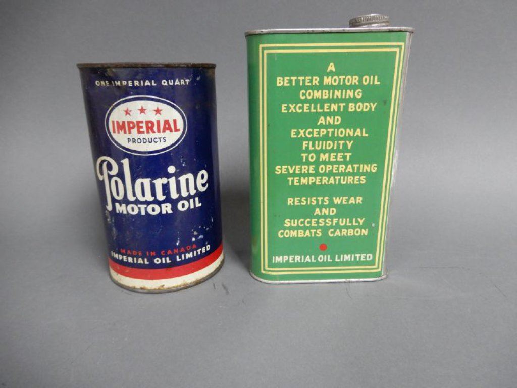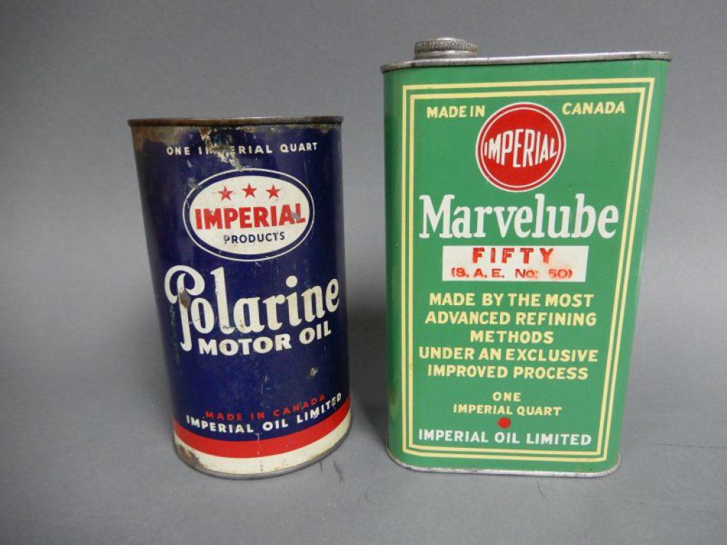 LOT OF 2 IMPERIAL IMP QT CANS IMPERIAL MARVELUBE CAN WITH CORRECT CAP - IMPERIAL 3 STAR POLARINE MOTOR OIL - FULL - EMBOSSED TOP - DENTING LOCATION: LOWER LEFT