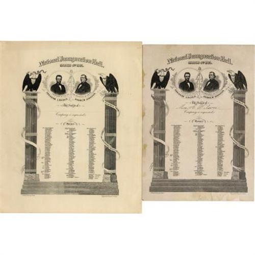 <B>LOT OF TWO INAUGURAL BALL INVITATIONS LINCOLN & JOHNSON MARCH 4TH 1865.</B></I> These two invitations are printed on card stock and are scarce. One is filled out, The Honor of “<I>Mrs. H. Wilson”</B></I> Company is requested. This item measures 7.5”x 10.5” The other is blank and measures 9.5”x 11.5”. Both items designed & drawn by Bruff, Engraved by Dempsey & O’ Toole. Very historical items. <BR><BR><B>Provenance: </B></I>Al. Emmett Fostell Collection<B> </B></I><BR><BR><B>Condition:</B></I> Smaller item has foxing and ½” tear at bottom and small creases, the other is very fine<BR><BR><b>Shipping:</b> Miscellaneous Collectibles, Smal (<a target="_blank" href="http://www.heritageauctions.com/common/shipping.php">view shipping information</a>)
