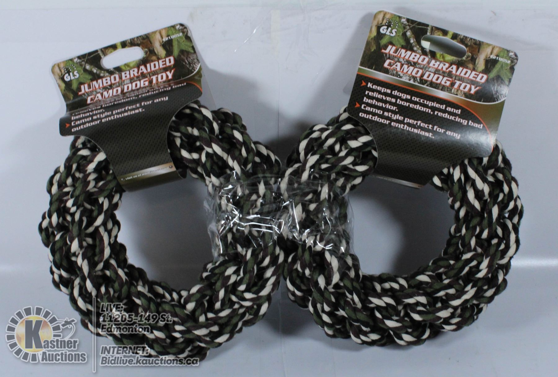 LOT OF 2 JUMBO BRAIDED CAMO DOG TOYS.