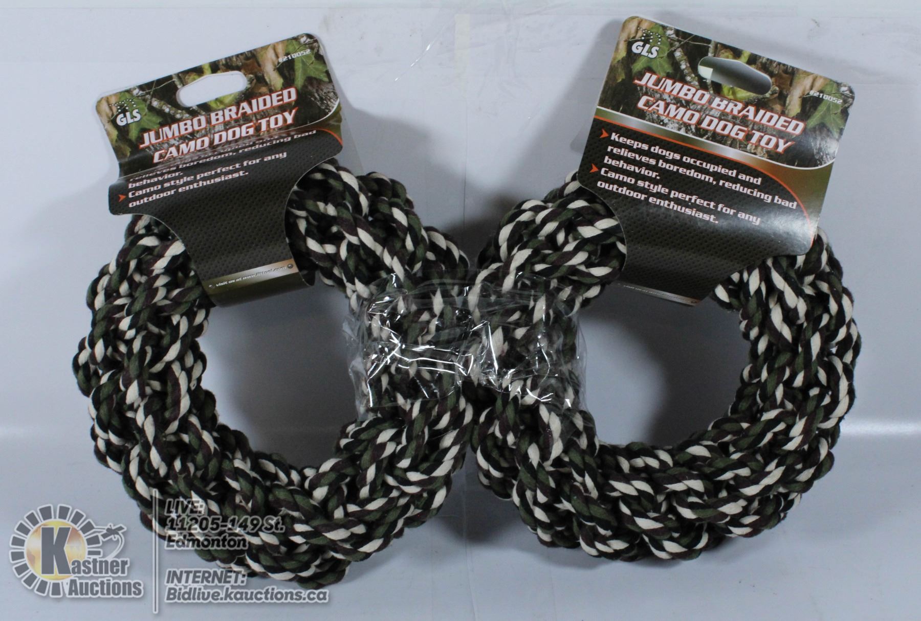 LOT OF 2 JUMBO BRAIDED CAMO DOG TOYS.