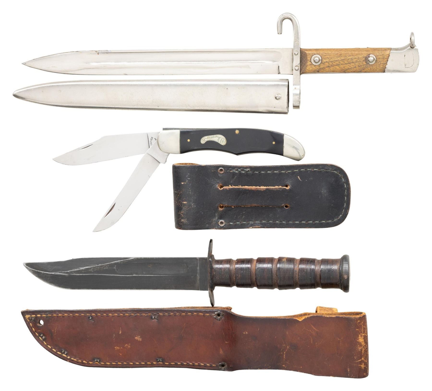 Lot of 2 knives and 1 Mauser pattern dress bayonet, including: 1) Unmarked K-BAR fighting knife. Blade measures 6 15/16" with an overall length of 12". Blued finish with grooved brown leather disc handle. Complete with unmarked brown leather sheath. CONDITION: blade retains large amounts of its original blue finish, showing edge wear fading to gray patina and light surface oxidation overall. Handle shows some marks and minor impressions from handling and storage, but otherwise remains sound. Sheath shows general overall wear and age related discoloration, with varying degrees of age related cracking and crazing. 2) Imperial Frontier #4624 double folding knife. Primary blade is marked "FRONTIER" above a powder horn on the left side of the ricasso, with "4624/ IMPERIAL/ USA" double stamped on the right. 2-piece brass pinned smooth black synthetic grip scales. Complete with black leather pouch with added U.S. Parachutist badge on closure flap. CONDITION: blades are very good overall, with a few spots of light surface oxidation/pitting, as well as a few scratches and marks. Grip scales show light scratching overall. Leather pouch remains malleable, showing spots of light to mild age related crazing. 3) Unmarked Austrian M1895 pattern dress bayonet. Metal components exhibit a nickel plated finish overall. 2-piece plain wood grip scales. Complete with nickel plated scabbard. CONDITION: nickel plated parts are good, showing a few patches of flaking, with pinprick flaking present on the pommel and rear strap. Scabbard shows scattered flaking and scratches. (02-25151/MLW). NON-GUN. $200-300.