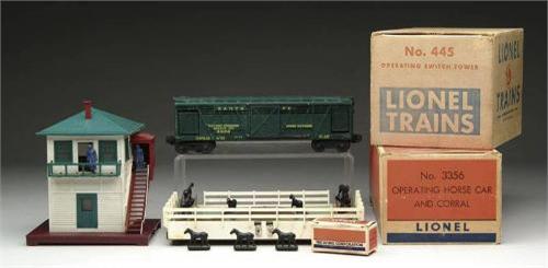 LOT OF 2 LIONEL ACCESSORIES. Consisting of # 445 Operating Switch Tower in original box. CONDITION: Excellent. #3356 Operating Horse Car and Corral in original box with inserts. Has horses in original box. CONDITION: Excellent. 1-5231-2 EC