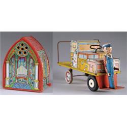 LOT OF 2 MECH. TOYS. 1) Chein musical tin cathedral. 2) Wind-up delivery platform toy by Unique Art. SIZE: Tallest is 9-1/2". CONDITION: Lot averages good and working. 1-1962; 1-2009 WP