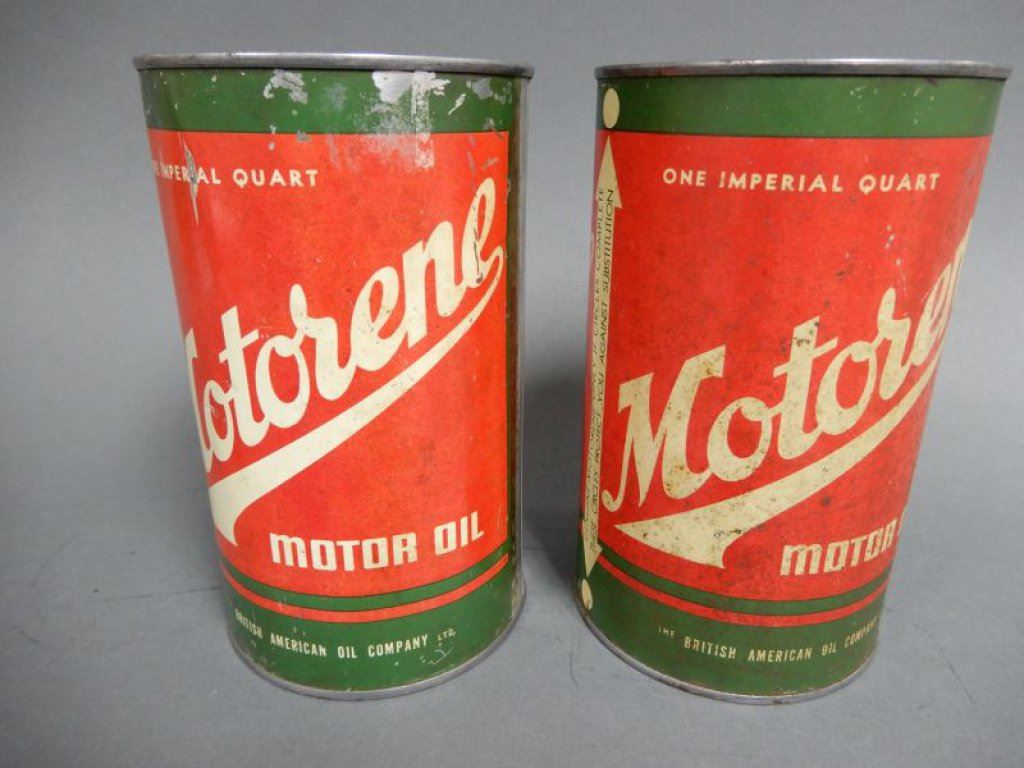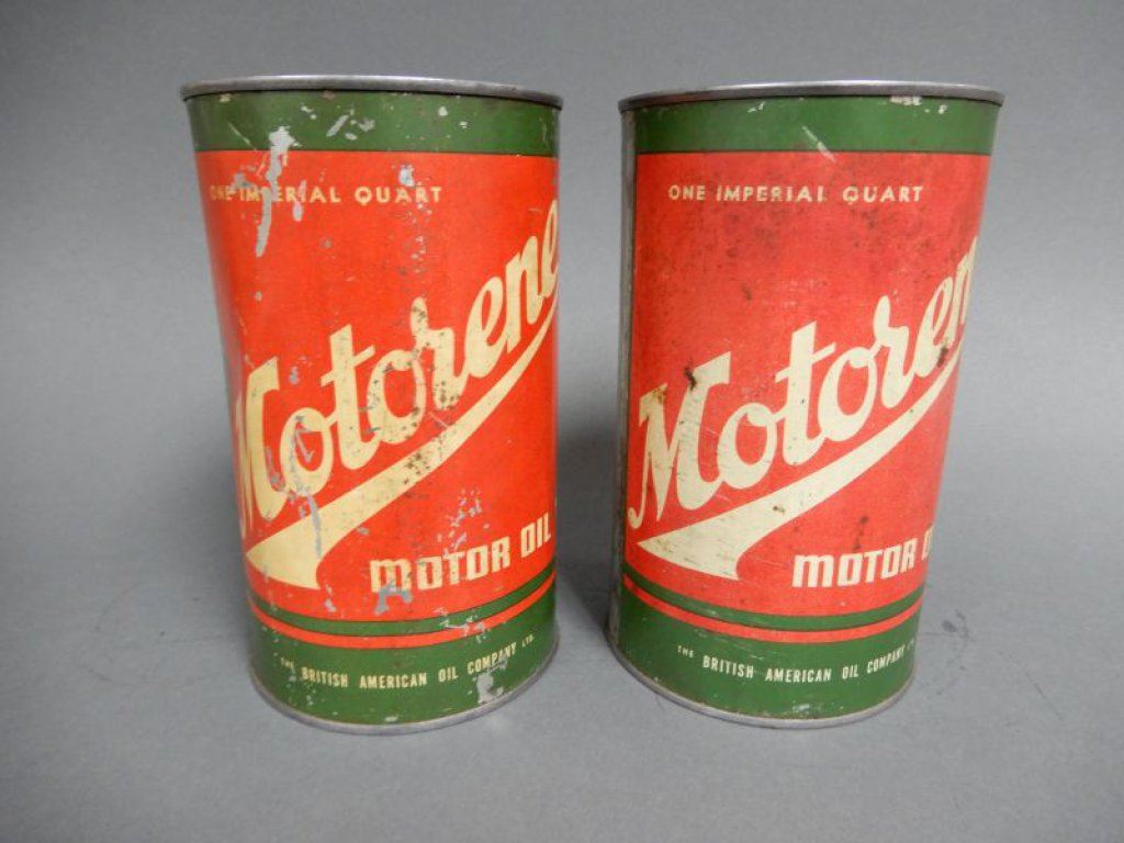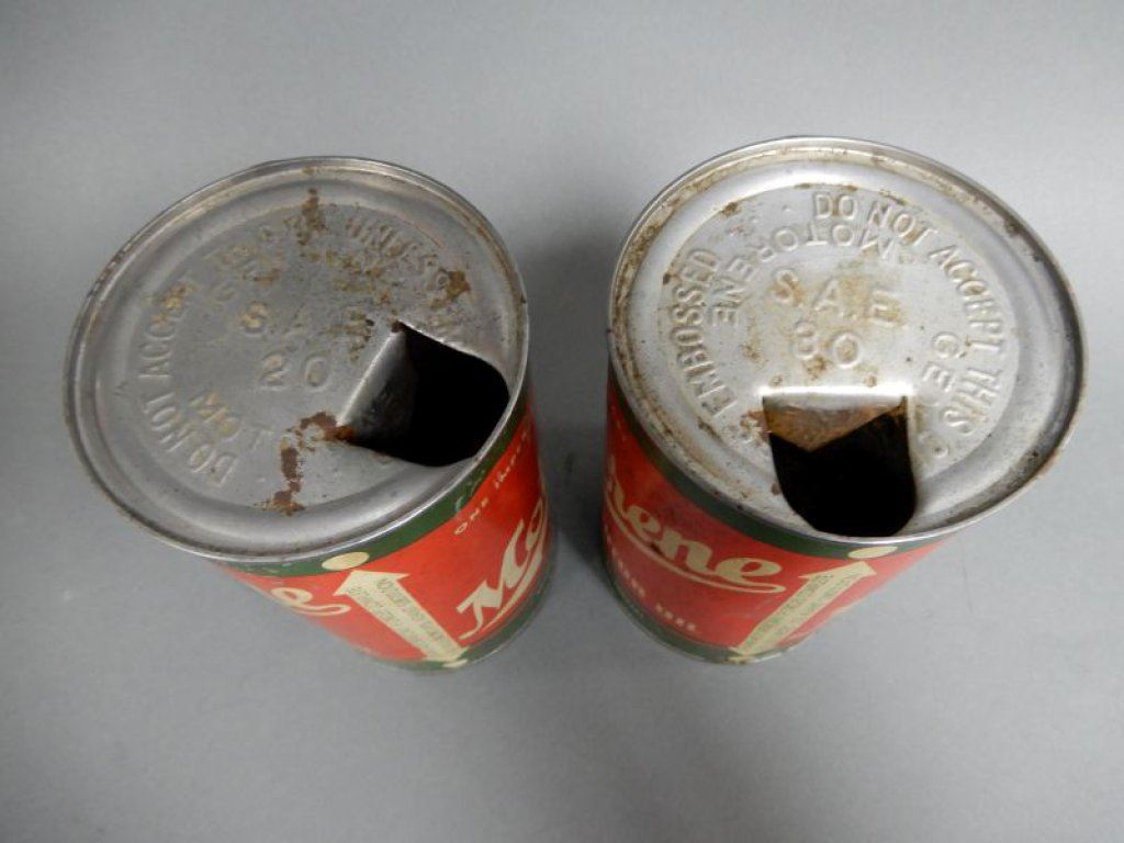 LOT OF 2 MOTORENE MOTOR OIL IMP QT CANS EMBOSSED TOP & BOTTOM - SOME WEAR LOCATION: LOWER BACKROOM