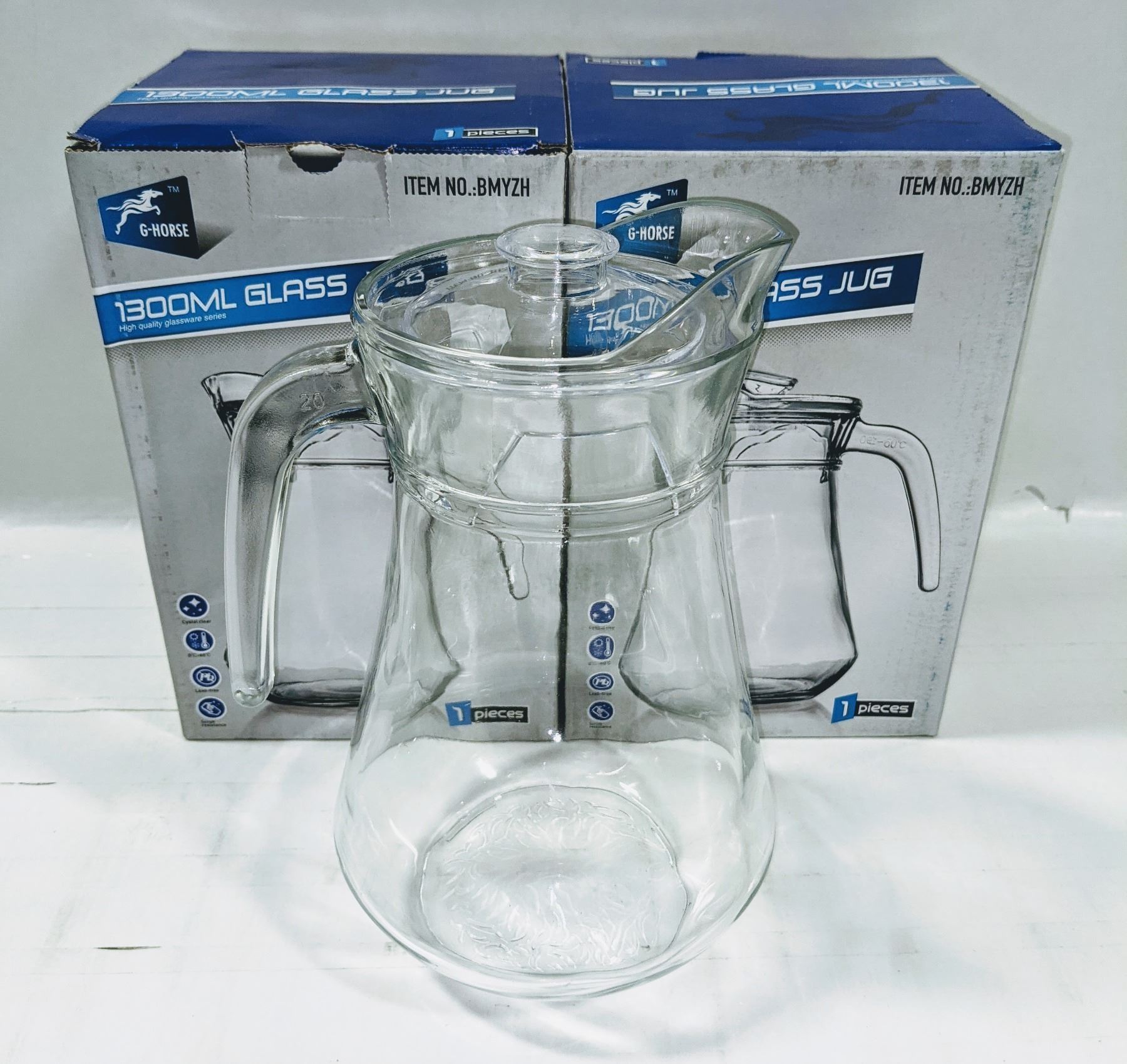 LOT OF 2 NEW 1300ML GLASS PITCHERS W/ LIDS