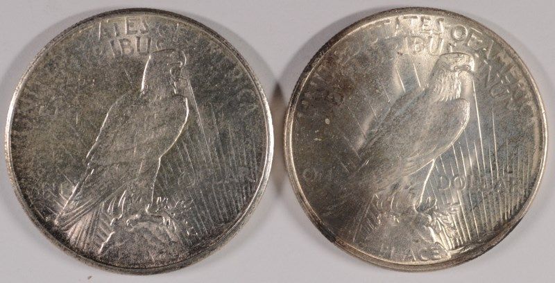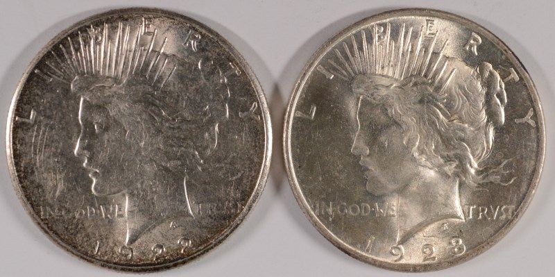 LOT OF (2) PEACE SILVER DOLLARS 1922-S AU, 1923 MS62