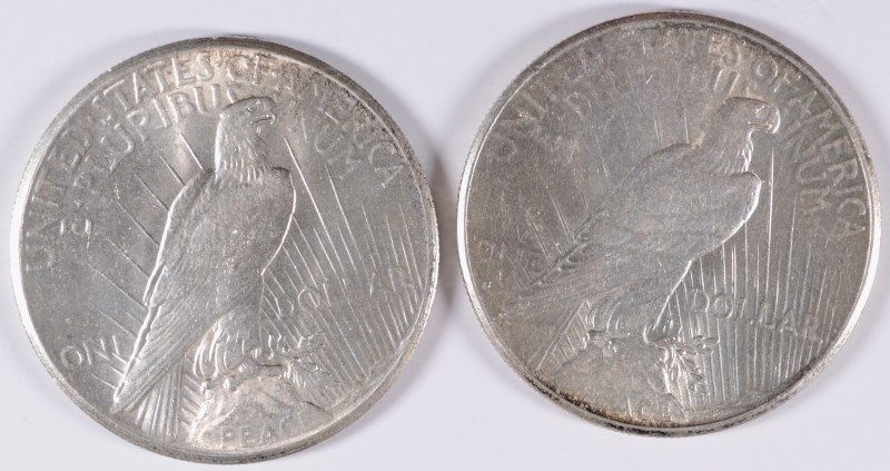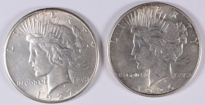 LOT OF (2) PEACE SILVER DOLLARS 1926-S AU, 1927 MS 62