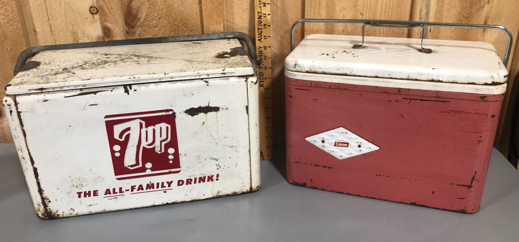 LOT OF 2 PICNIC COOLERS - 7UP & COLEMAN
