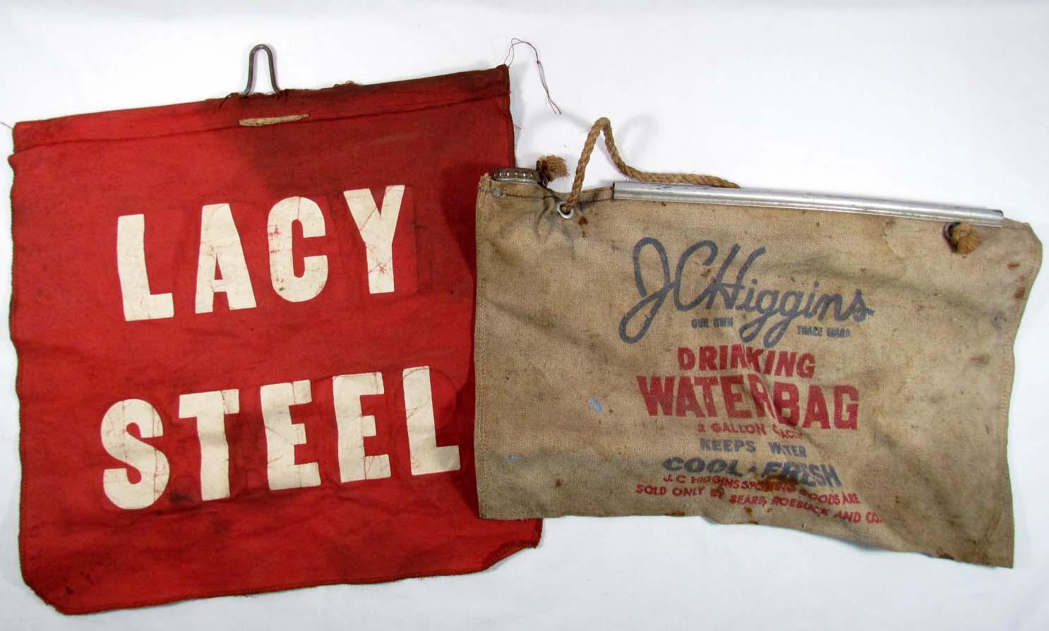 LOT OF 2 PRIMITIVE ADVERTISING - Lacy Steel flag and J.C. Higgings hanging water bag