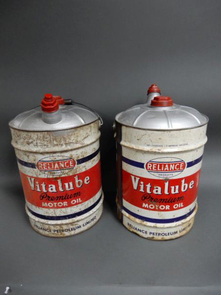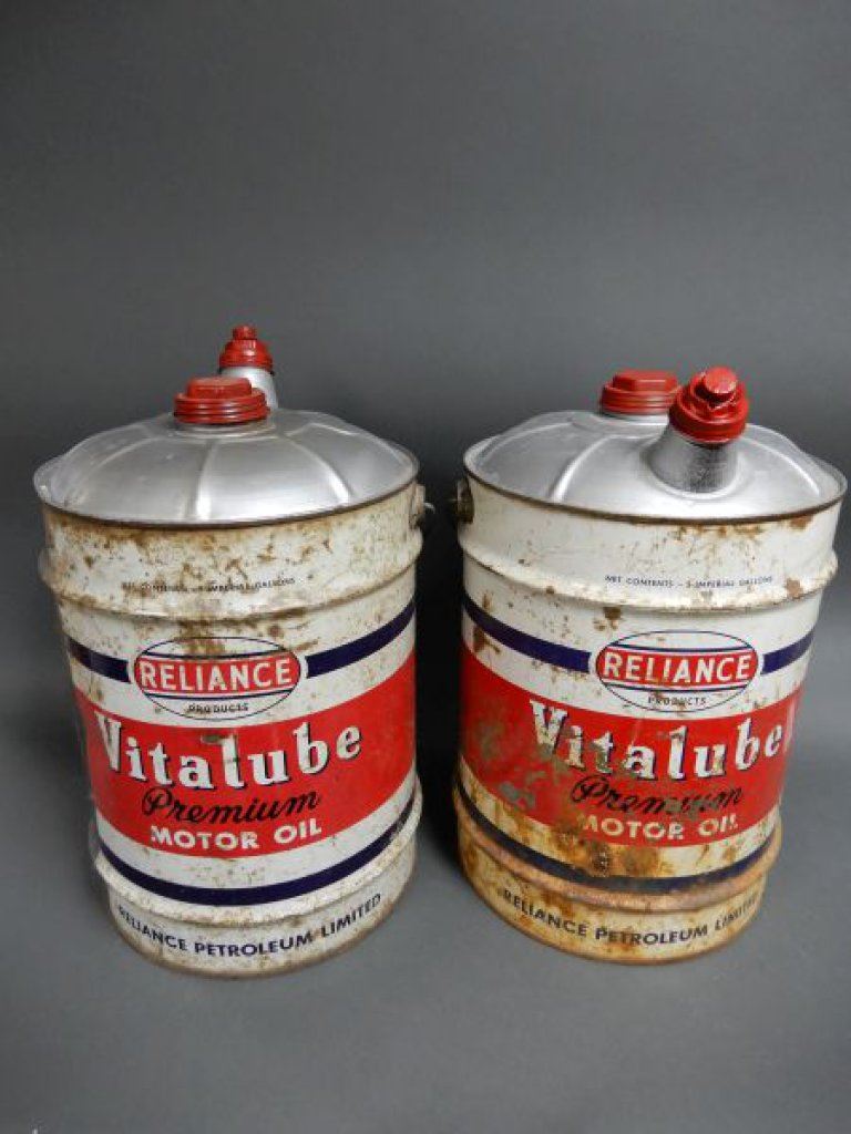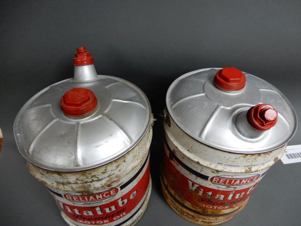 LOT OF 2 RELIANCE VITALUBE 5 IMP GAL CANS CORRECT CAPS - SURFACE RUST LOCATION: LOWER RIGHT