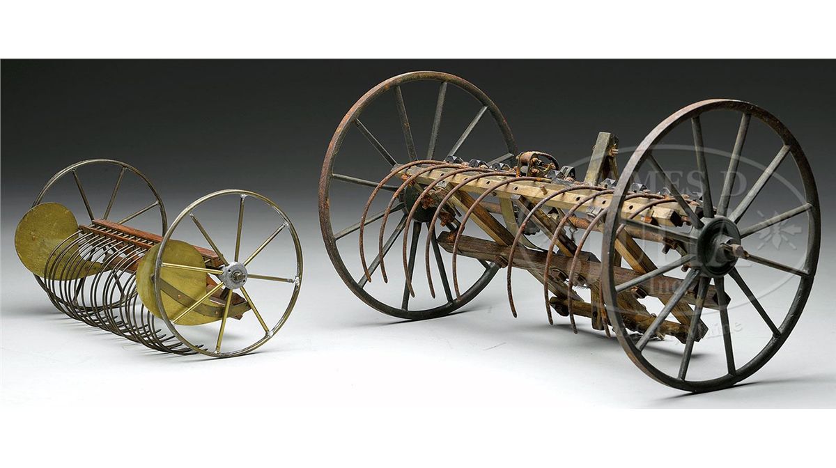 Similarly styled farm implements consisting of two large spoke wheels between which are wooden frameworks set with a series of curved tines to gather hay while the unit is pulled by a team of horses. Smaller example has two brass side fins that flip up keeping hay from getting caught in the wheels. No model or makers marks can be seen. SIZE: Largest 13-1/2" w x 8" h. Smaller 9-1/4 w x 5" h. CONDITION: Lot is fair to good with some broken, repaired and/or missing parts. Larger example show surface rust to metal components. 1-13542