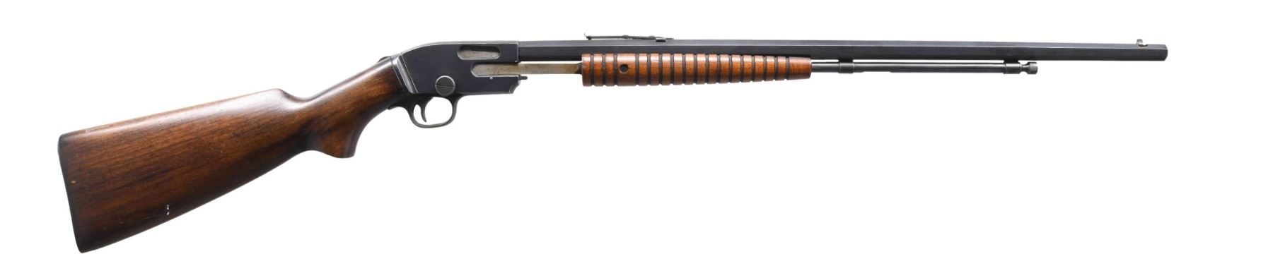 1) SAVAGE 1914 PUMP ACTION RIFLE. Cal 22 S, L & LR. S# 33690. Bbl. 24" oct. Bead front sight. Sporting style rear sight. Upper tang has two screw holes present for further sight mounting. Tube fed rimfire rifle. Blued finish. Blued finish. Pistol grip walnut stock & grooved forend. Forend is lighter in color than buttstock. CONDITION: stock set shows a few cracks behind frame, a few scattered chips & handling marks. Metal retains 85% original blue with scattered edge wear, light oxidation & handling wear. Action functions properly when hand cycled. Worn bore with scattered patches of pitting. (24-5094/MJC). 2) SAVAGE MODEL 3B BOLT ACTION RIFLE. Cal. 22 RF. NSN. Bbl. 24" rnd. Gold bead front sight. Sporting style rear sight. Receiver mounted Lyman 55S aperture rear sight. Single shot bolt action rifle. Blued finish. Walnut pistol grip stock. CONDITION: sanded stock has added varnish with scattered flaking & handling wear. Metal retains 60% blue with areas turning gray, some light oxidation, edge wear & dings. Action functions properly when hand cycled. Very good bore. (24-5100/MJC). BOTH CURIO. $375-500 for pair.