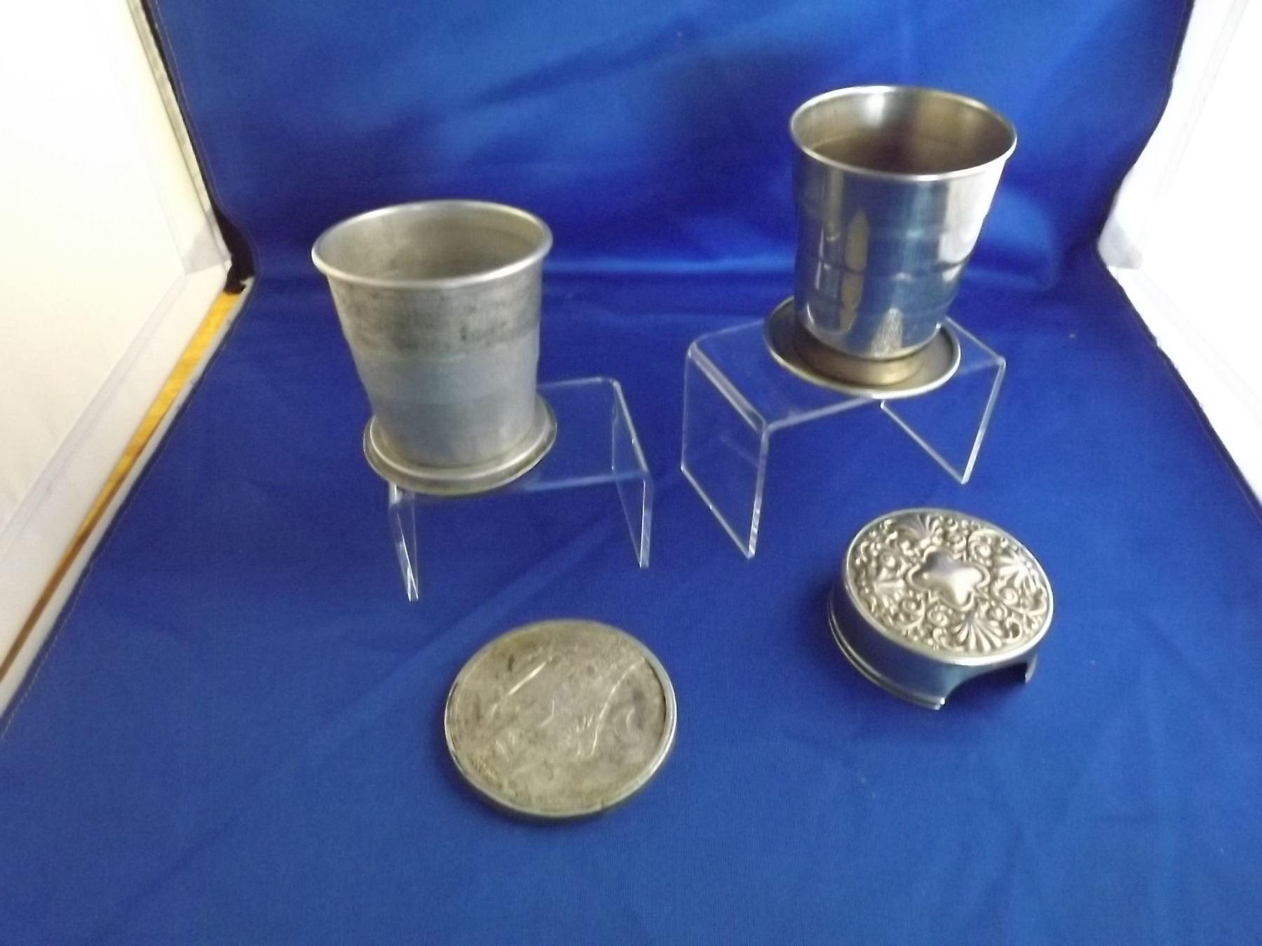 LOT OF 2 STAMPED LID MILITARY STYLE COLLAPSABLE CUPS;